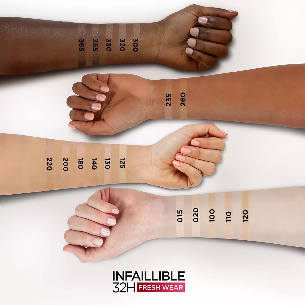 Wybierz nowy, jeszcze bardziej długotrwale kryjący podkład do twarzy z dodatkowym efektem rozświetlania. L'Oreal Paris Infaillible 32H Fresh Wear z SPF 25 pozwoli Ci się cieszyć niezawodnym makijażem aż do 32 godzin. Świeża, naturalna skóra przez cały dzień, a nawet dłużej to efekt lekkiej i oddychającej formuły podkładu, odpornej na ścieranie i zmianę koloru. Według 92,9% kobiet, podkład sprawdza się idealnie także przy noszeniu i zdejmowaniu maseczki, według 94,2% zapewnia idealną i nieskazitelną cerę, a dla 80,2% kobiet, skóra jest promienna nawet po wysiłku fizycznym. Nowy Infaillible 32H Fresh Wear ma to samo satynowe wykończenie, lecz dzięki mikro perełkom rozpraszającym światło, cera jest bardziej promienna, a dodatek witaminy CG sprawia, że z czasem staje się jeszcze bardziej rozświetlona. Testowany dermatologicznie, odpowiedni dla każdego rodzaju skóry.