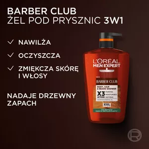 L'Oreal Paris Men Expert Barber Club 3w1 to żel do mycia ciała, włosów i brody w dużym, ekonomicznym opakowaniu 1000 ml. Formuła z olejkiem eterycznym z cedru skutecznie oczyszcza, zmiękcza i nawilża, pozostawiając długotrwały, drzewny zapach. Produkt został przetestowany dermatologicznie i okulistycznie, dzięki czemu jest bezpieczny nawet dla wrażliwej skóry oraz okolic oczu. Idealny wybór dla mężczyzn ceniących wygodę, skuteczność i pielęgnację na najwyższym poziomie.