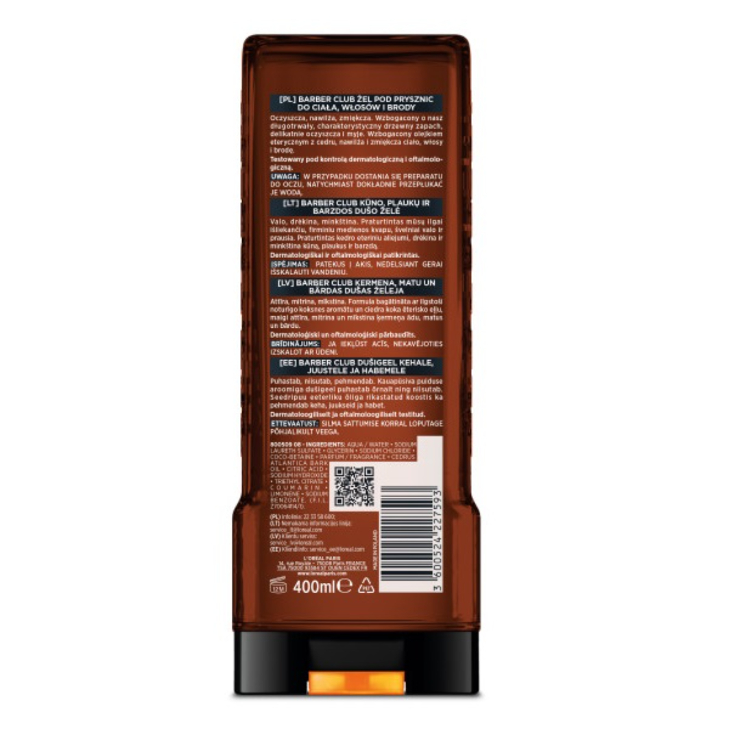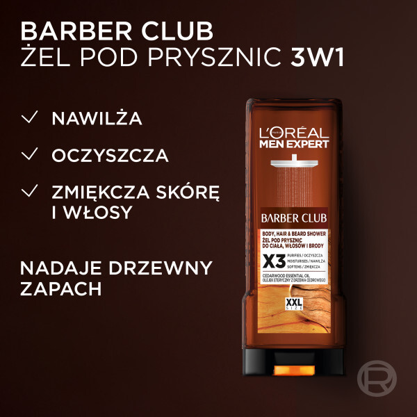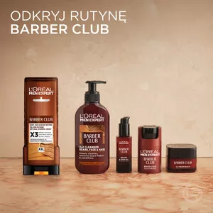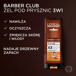 L'Oreal Paris Men Expert Barber Club 3w1 to żel do mycia ciała, włosów i brody, który łączy skuteczne oczyszczanie z pielęgnacją. Formuła wzbogacona olejkiem eterycznym z cedru nie tylko dokładnie myje, ale także zmiękcza i nawilża skórę oraz włosy, pozostawiając długotrwały, drzewny zapach. Produkt został przetestowany dermatologicznie i okulistycznie, co gwarantuje bezpieczeństwo stosowania nawet w przypadku wrażliwej skóry i okolic oczu.