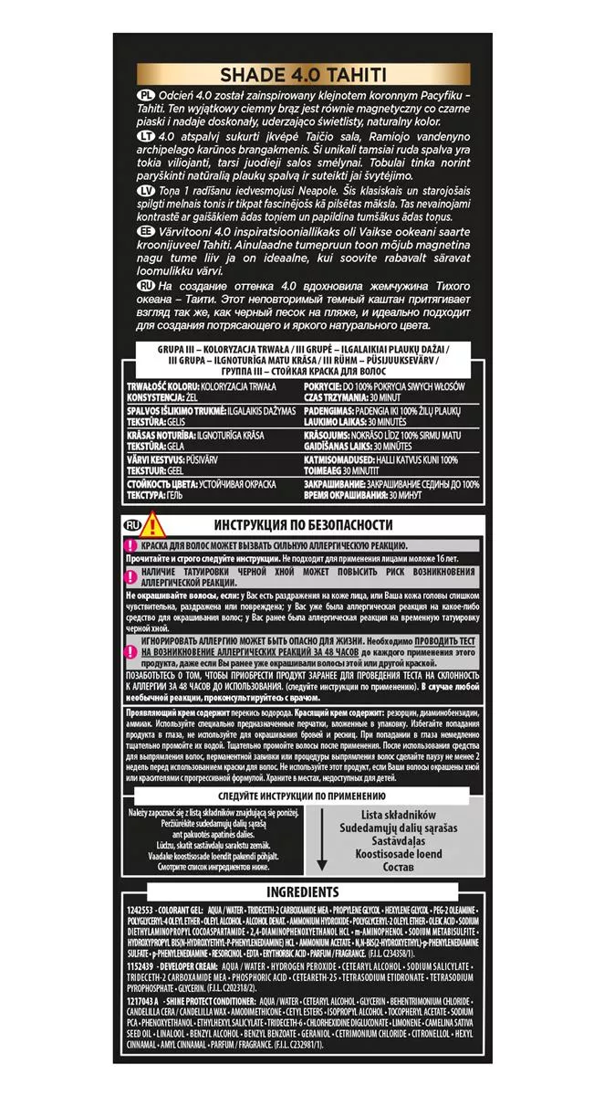 L'Oreal Paris Preference Farba do włosów 4.0 Tahiti to wyjątkowa propozycja dla osób pragnących uzyskać magnetyczny, ciemny brąz inspirowany klejnotem koronnym Pacyfiku - Tahiti. Ten odcień, równie imponujący jak czarne piaski, nadaje włosom doskonały, świetlisty i naturalny kolor.
