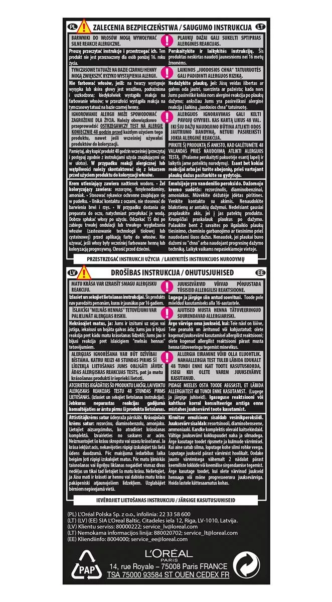1242553 - Aqua / Water • Trideceth-2 Carboxamide Mea • Propylene Glycol • Hexylene Glycol • Peg-2 Oleamine • Polyglyceryl-4 Oleyl Ether • Oleyl Alcohol • Alcohol Denat. • Ammonium Hydroxide • Polyglyceryl-2 Oleyl Ether • Oleic Acid • Sodium Diethylaminopropyl Cocoaspartamide • 2,4-diaminophenoxyethanol Hcl • M-aminophenol • Sodium Metabisulfite • Hydroxypropyl Bis(n-hydroxyethyl-p-phenylenediamine) Hcl • Ammonium Acetate • N,n-bis(2-hydroxyethyl)-p-phenylenediamine Sulfate • P-phenylenediamine • Resorcinol • Edta • Erythorbic Acid • Parfum / Fragrance (f.i.l. C234358/1).