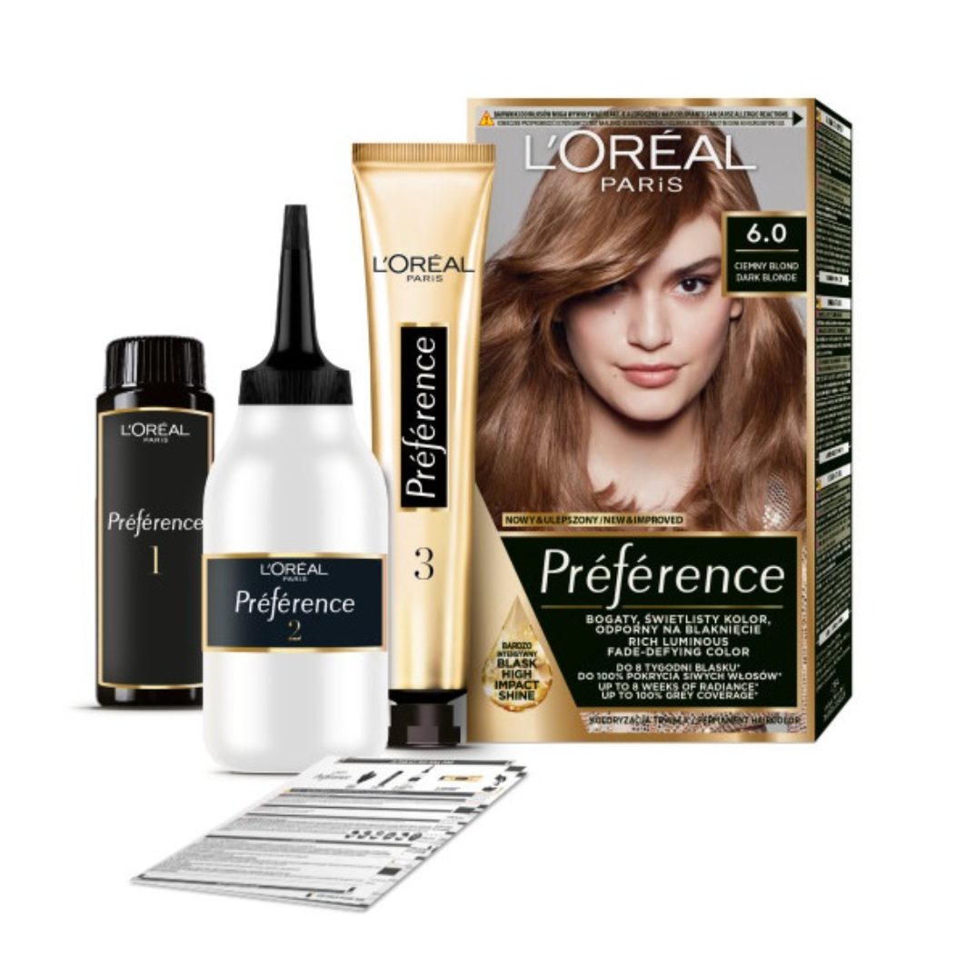 Odkryj wyjątkowy kolor i blask z farbą do włosów L'Oreal Paris Preference 6.0 Dark Blonde. Opracowana z myślą o długotrwałej intensywności koloru, ta farba zawiera system przeciwdziałający blaknięciu, który zapewnia aż do 8 tygodni świetlistego i pełnego wyrazu koloru.