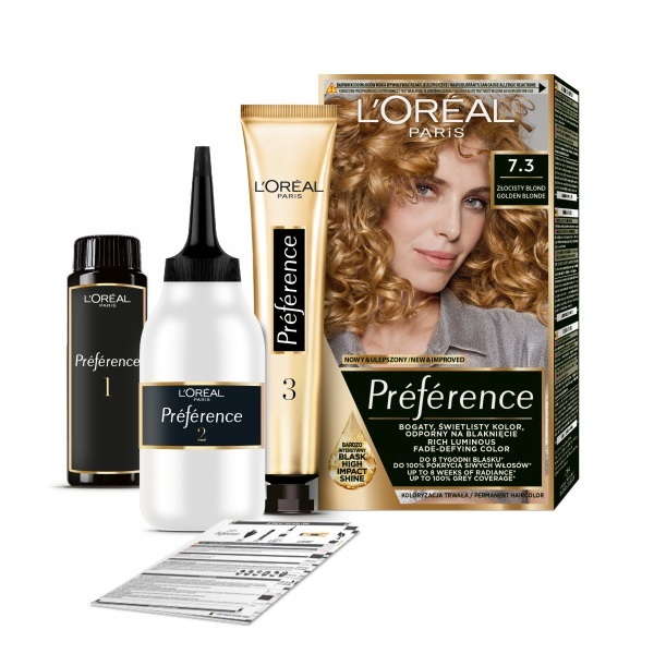 L'Oreal Paris Preference farba do włosów 7.3 Golden Blonde to wyjątkowy produkt, który zapewnia do 8 tygodni intensywnego i pełnego wyrazu koloru dzięki żelowej formule z olejkiem i wysokiej koncentracji trwałych barwników.