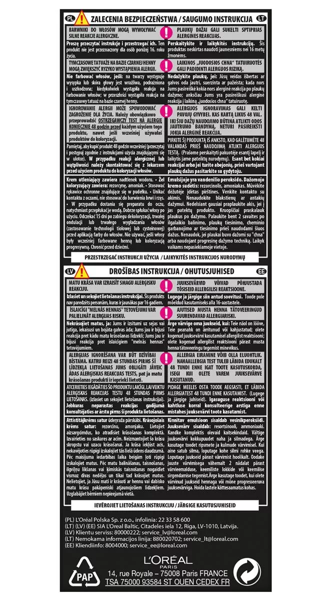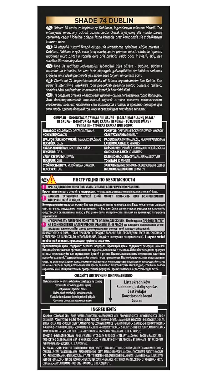 1242540 - Aqua / Water • Trideceth-2 Carboxamide Mea • Propylene Glycol • Hexylene Glycol • Peg-2 Oleamine • Polyglyceryl-4 Oleyl Ether • Oleyl Alcohol • Alcohol Denat. • Ammonium Hydroxide • Polyglyceryl-2 Oleyl Ether • Oleic Acid • Sodium Diethylaminopropyl Cocoaspartamide • P-aminophenol • 2-amino-3-hydroxypyridine • 4-amino-2-hydroxytoluene • Sodium Metabisulfite • 6-hydroxyindole • 2-methyl-5-hydroxyethylaminophenol • Ammonium Acetate • Resorcinol • Edta • Erythorbic Acid • Parfum / Fragrance (f.i.l. C234345/3).