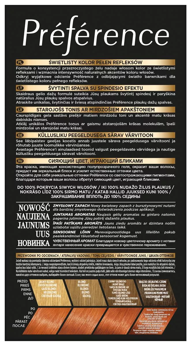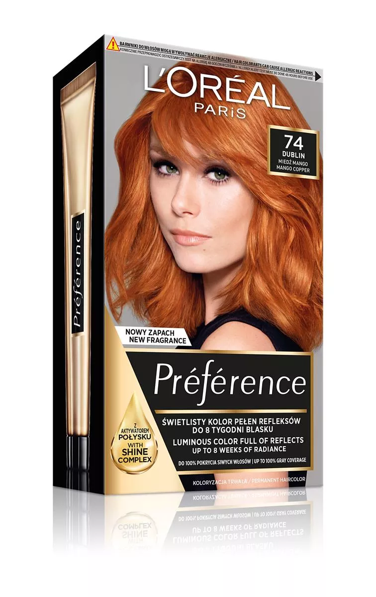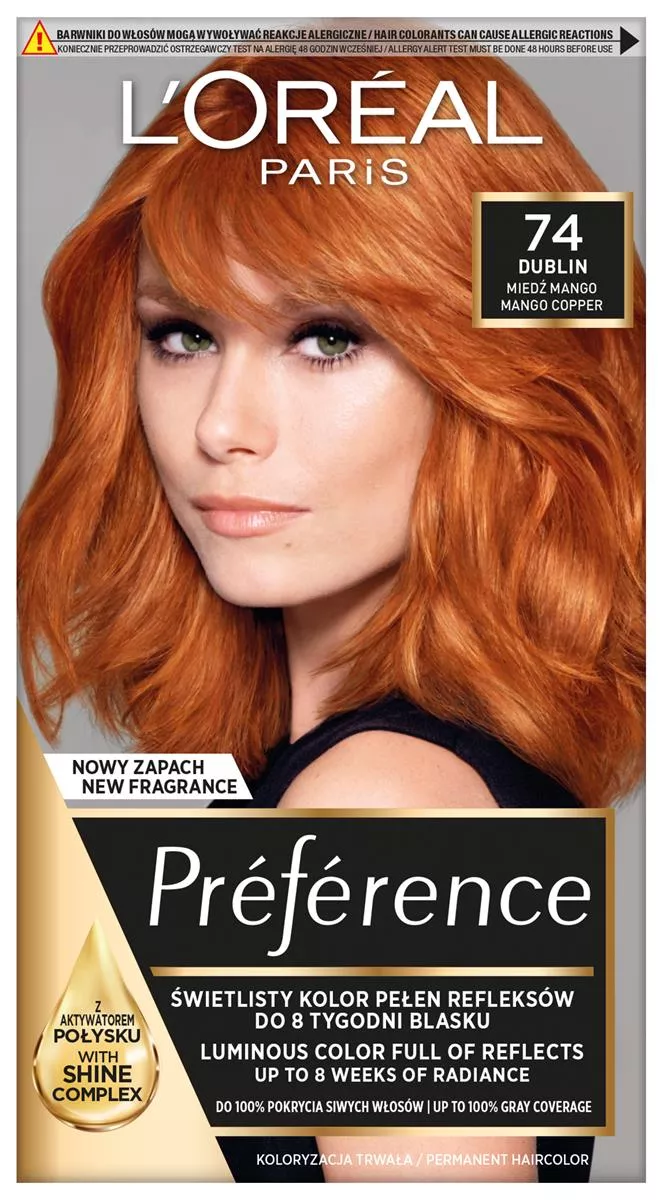 Farba do włosów L'Oreal Paris Preference 74 Mango to sekret intensywnego połysku, który zawdzięcza opatentowanym barwnikom wysokiej odporności. Dzięki większej objętości w porównaniu z tradycyjnymi barwnikami koloryzującymi, barwniki te dłużej pozostają we wnętrzu włosa, zapewniając długotrwały, intensywny kolor i doskonałe pokrycie siwych włosów. Rezultat to szlachetny, pełen życia kolor, który zachowuje połysk przez wiele tygodni.