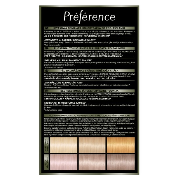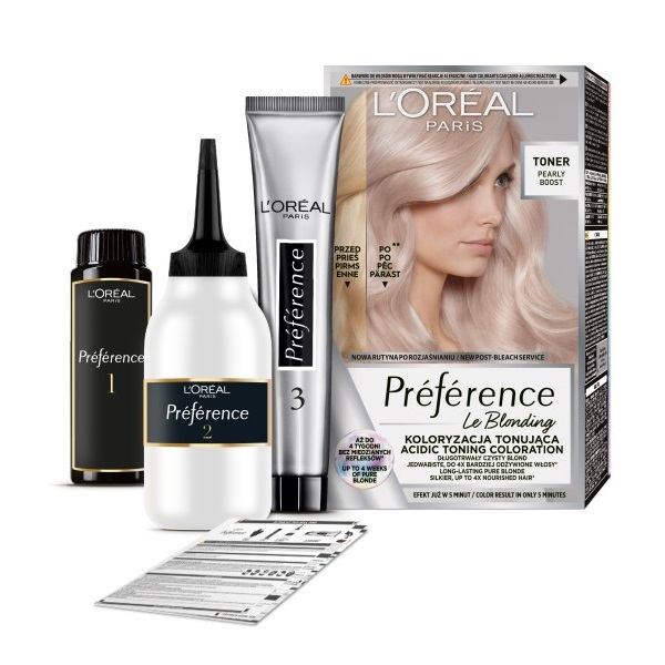 L'Oreal Paris Preference Le Blonding koloryzacja tonizująca do włosów Pearly Boost to innowacyjny produkt, który pozwala na skuteczne neutralizowanie niechcianych żółtych i miedzianych refleksów. Dzięki technologii farbowania bez amoniaku, zapewnia długotrwały efekt czystego blondu.