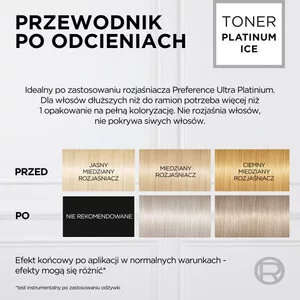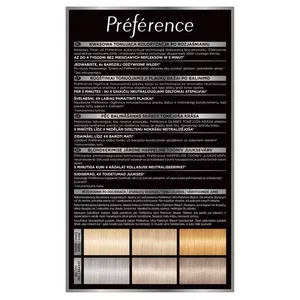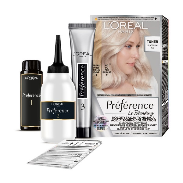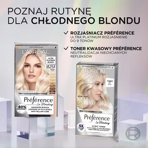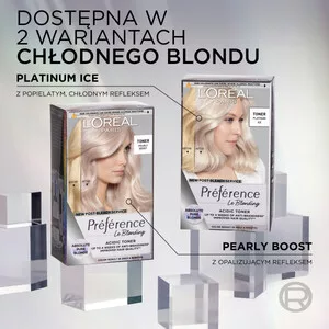 Odkryj nową jakość blondu z L'Oreal Paris Preference Le Blonding koloryzacja tonizująca do włosów Platinum Ice. Ta innowacyjna formuła bez amoniaku skutecznie neutralizuje niechciane żółte i miedziane refleksy, zapewniając długotrwały efekt czystego blondu. Dzięki zastosowaniu kwasowej technologii, włosy pozostają jedwabiste i 4 razy bardziej odżywione.