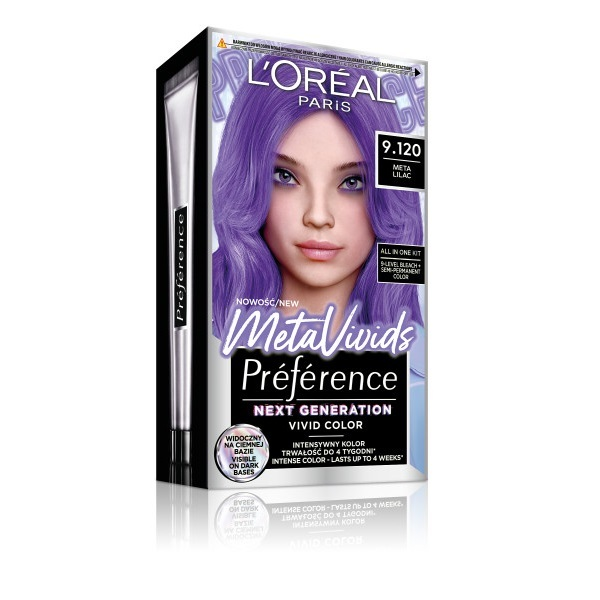 Odkryj nową jakość koloryzacji z farbą do włosów L'Oreal Paris Preference MetaVivids 9.120 Meta Lilac. Ta innowacyjna farba została zainspirowana cyfrowym światem i łączy w sobie najnowsze technologie, oferując rozwiązanie typu „wszystko w jednym” z rozjaśniaczem i półtrwałą koloryzacją.