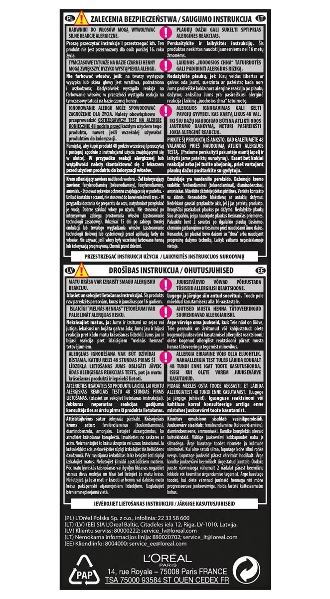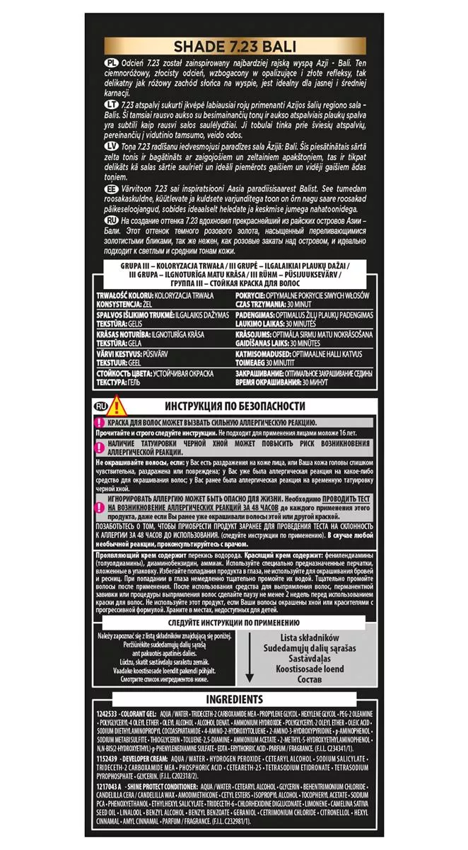 1242533 - Aqua / Water • Trideceth-2 Carboxamide Mea • Propylene Glycol • Hexylene Glycol • Peg-2 Oleamine • Polyglyceryl-4 Oleyl Ether • Oleyl Alcohol • Alcohol Denat. • Ammonium Hydroxide • Polyglyceryl-2 Oleyl Ether • Oleic Acid • Sodium Diethylaminopropyl Cocoaspartamide • 4-amino-2-hydroxytoluene • 2-amino-3-hydroxypyridine • P-aminophenol • Sodium Metabisulfite • Thioglycerin • Toluene-2,5-diamine • Ammonium Acetate • 2-methyl-5-hydroxyethylaminophenol • N,n-bis(2-hydroxyethyl)-p-phenylenediamine Sulfate • Edta • Erythorbic Acid • Parfum / Fragrance (f.i.l. C234341/1).