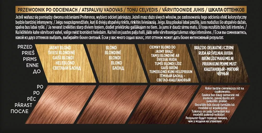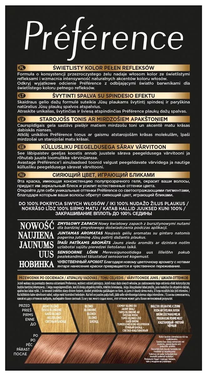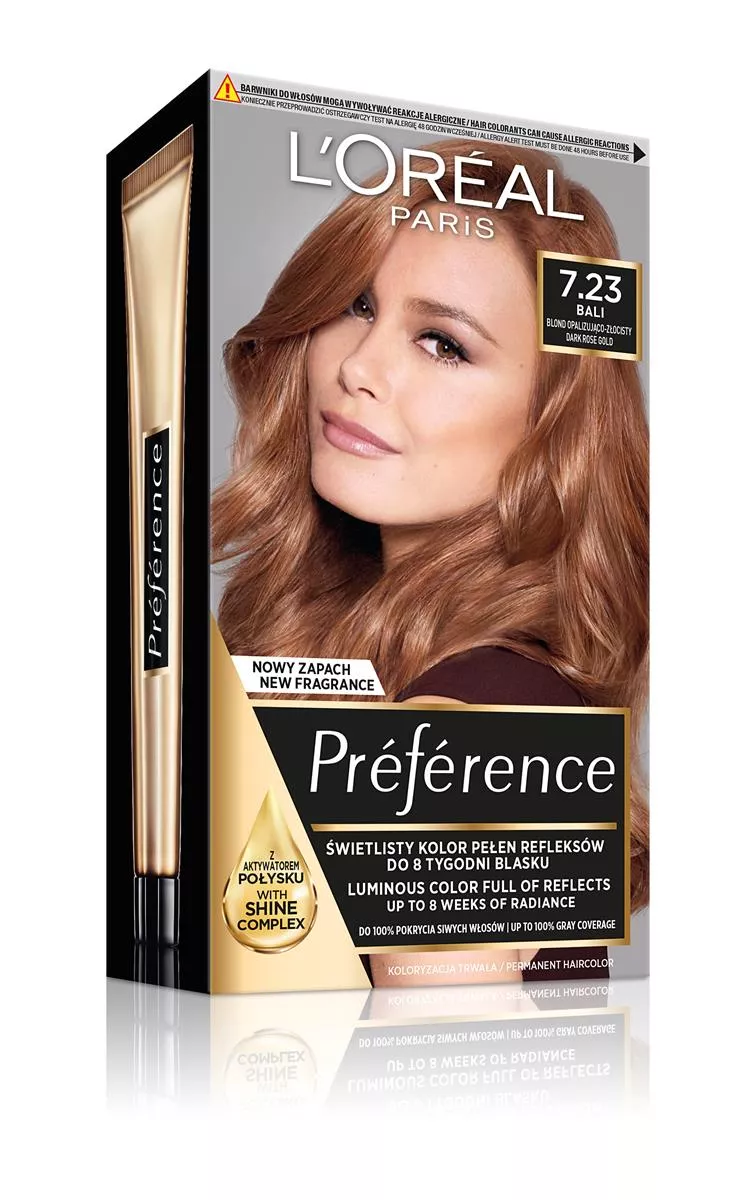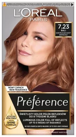 Farba do włosów L'Oreal Paris Préférence to rozwiązanie dla osób poszukujących trwałej koloryzacji z wyjątkowym połyskiem. Odcień 7.23 Bali, Blond Opalizująco-Złocisty, zapewnia elegancki i pełen blasku kolor, który utrzymuje się nawet do 8 tygodni. Produkt skutecznie pokrywa siwe włosy i nie zmywa się podczas mycia, dzięki czemu możesz cieszyć się intensywnym kolorem przez długi czas.