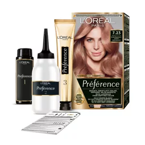 Farba do włosów L'Oreal Paris Préférence to rozwiązanie dla osób poszukujących trwałej koloryzacji z wyjątkowym połyskiem. Odcień 7.23 Bali, Blond Opalizująco-Złocisty, zapewnia elegancki i pełen blasku kolor, który utrzymuje się nawet do 8 tygodni. Produkt skutecznie pokrywa siwe włosy i nie zmywa się podczas mycia, dzięki czemu możesz cieszyć się intensywnym kolorem przez długi czas.