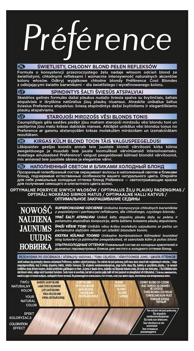 L'Oreal Paris Préférence Trwała Farba do Włosów w odcieniu 9.12 Siberia to idealne rozwiązanie dla osób pragnących uzyskać bardzo jasny popielaty beżowy blond. Wyróżniają się wyjątkowymi chłodnymi blondami wzbogaconymi o popielate i perłowe tony oraz nową maskę przeciw miedzianym refleksom. Formuła o konsystencji przezroczystego żelu zapewnia świetliste i wyrafinowane wykończenie, a efekt utrzymuje się aż do 6 tygodni.