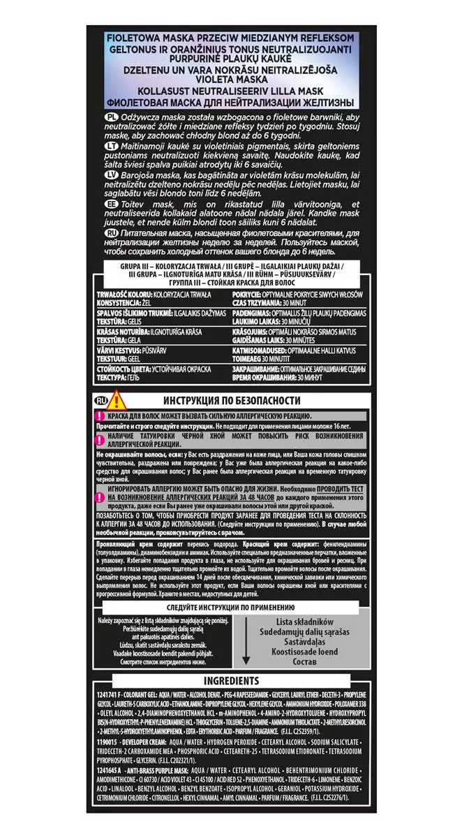 1241741 F - Aqua / Water • Alcohol Denat. • Peg-4 Rapeseedamide • Glyceryl Lauryl Ether • Deceth-3 • Propylene Glycol • Laureth-5 Carboxylic Acid • Ethanolamine • Dipropylene Glycol • Hexylene Glycol • Ammonium Hydroxide • Poloxamer 338 • Oleyl Alcohol • 2,4-diaminophenoxyethanol Hcl • M-aminophenol • 4-amino-2-hydroxytoluene • Hydroxypropyl Bis(n-hydroxyethyl-p-phenylenediamine) Hcl • Thioglycerin • Toluene-2,5-diamine • Ammonium Thiolactate • 2-methylresorcinol • 2-methyl-5-hydroxyethylaminophenol • Edta • Erythorbic Acid • Parfum / Fragrance (f.i.l. C252359/1).