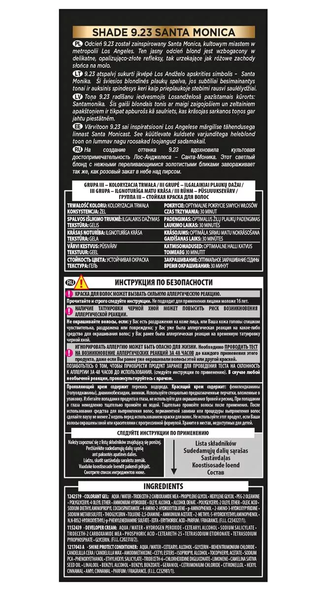 1242519 - Aqua / Water, Trideceth-2 Carboxamide Mea, Propylene Glycol, Hexylene Glycol, Peg-2 Oleamine, Polyglyceryl-4 Oleyl Ether, Ammonium Hydroxide, Oleyl Alcohol, Alcohol Denat., Polyglyceryl-2 Oleyl Ether, Oleic Acid, Sodium Diethylaminopropyl Cocoaspartamide, 4-amino-2-hydroxytoluene, P-aminophenol, 2-amino-3-hydroxypyridine, Sodium Metabisulfite, Thioglycerin, Toluene-2,5-diamine, Ammonium Acetate, 2-methyl-5-hydroxyethylaminophenol, N,n-bis(2-hydroxyethyl)-p-phenylenediamine Sulfate, Edta, Erythorbic Acid, Parfum / Fragrance (f.i.l. C234327/1).