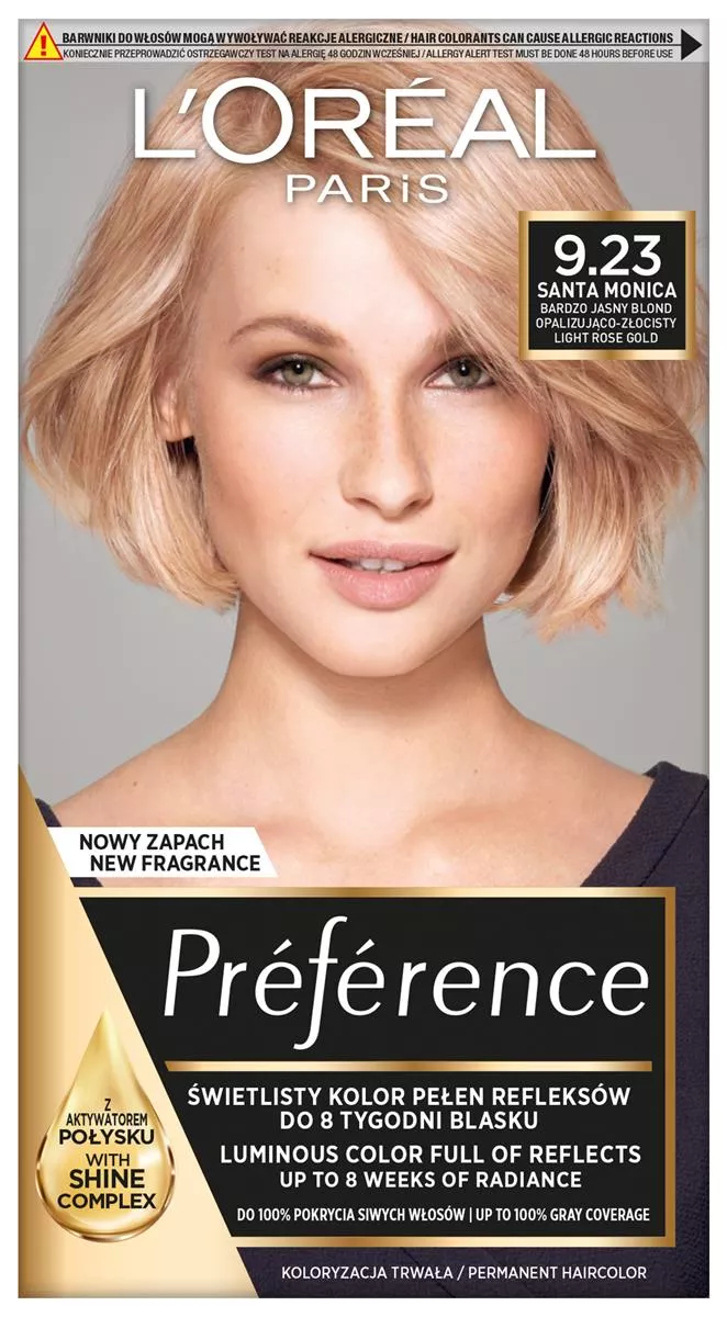 L'Oreal Paris Préférence Trwała Farba do włosów 9.23 Santa Monica to doskonały wybór dla osób pragnących uzyskać bardzo jasny blond o opalizująco-złocistym odcieniu. Dzięki innowacyjnej formule z aktywatorem połysku, Twoje włosy zachowają olśniewający blask nawet do 8 tygodni. Farba zapewnia trwałą koloryzację, która nie zmywa się podczas mycia, a także skutecznie pokrywa siwe kosmyki.