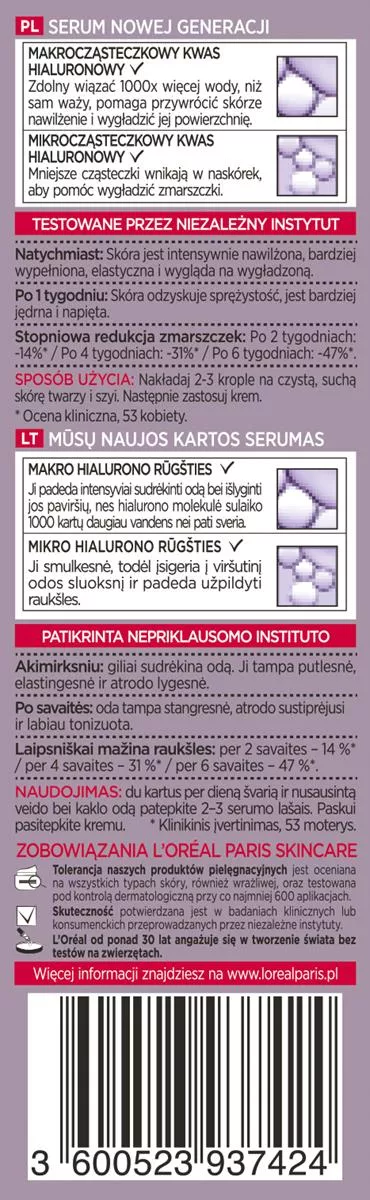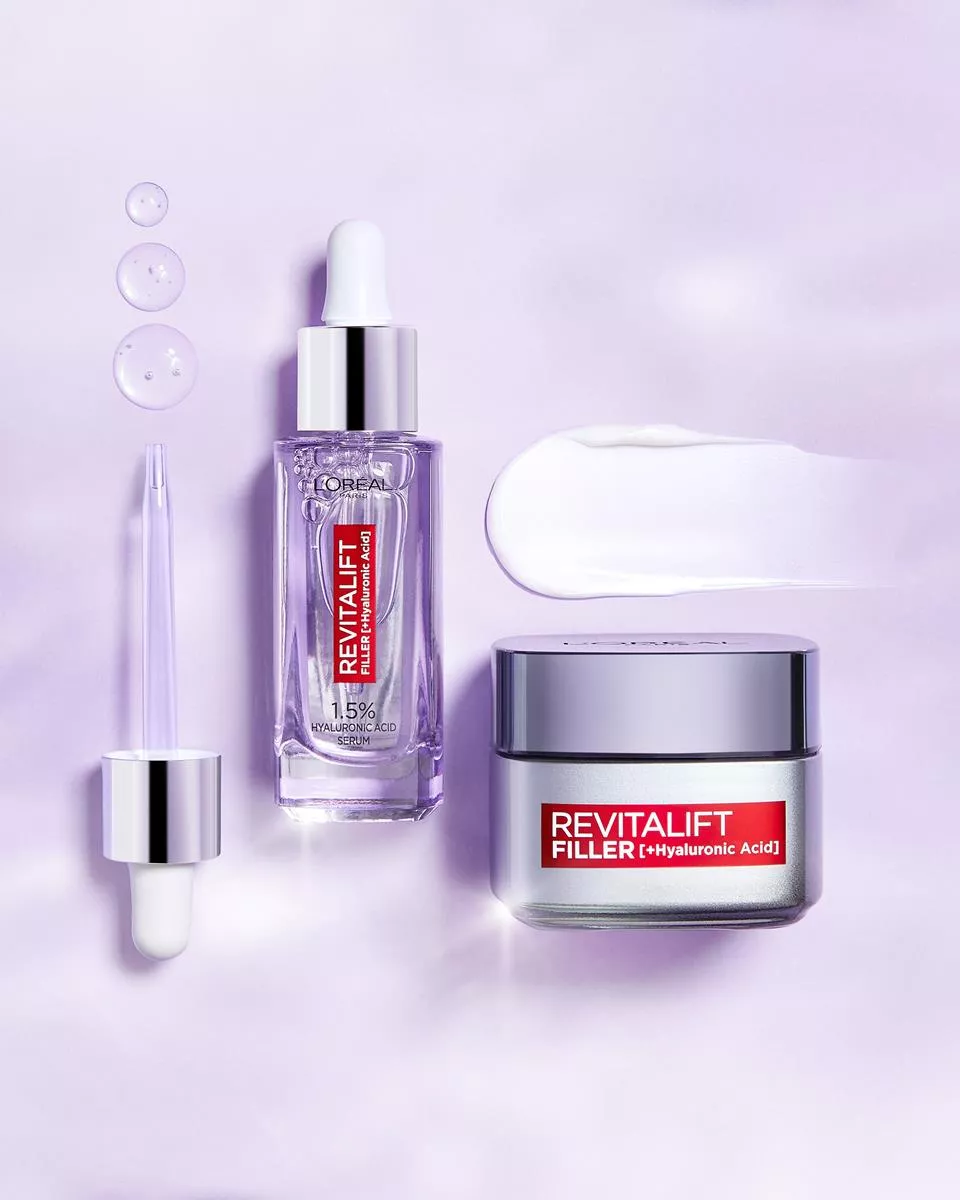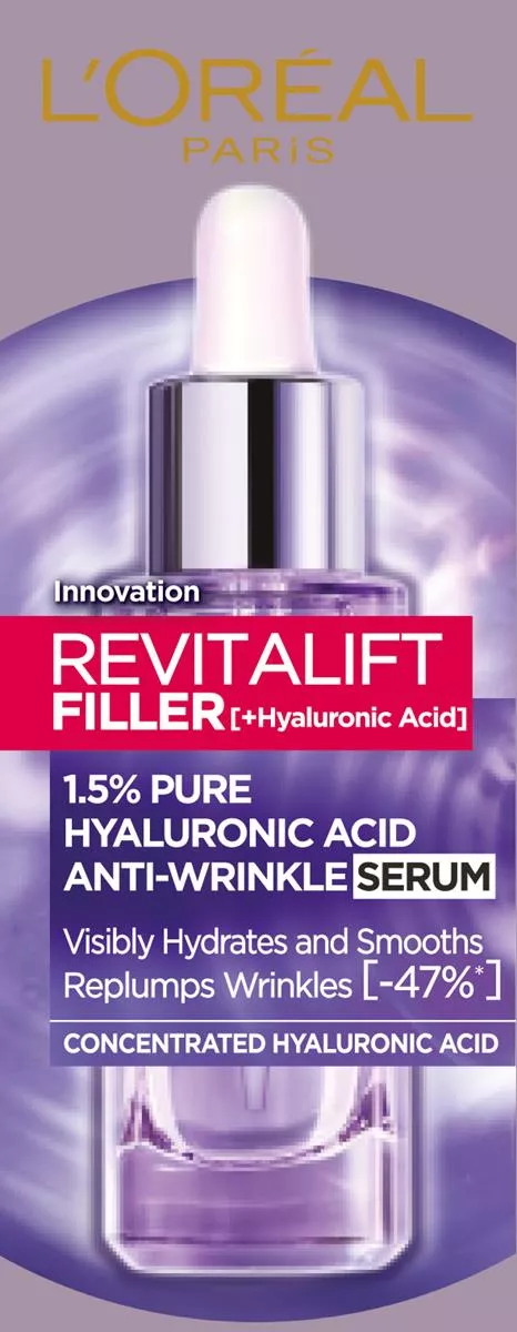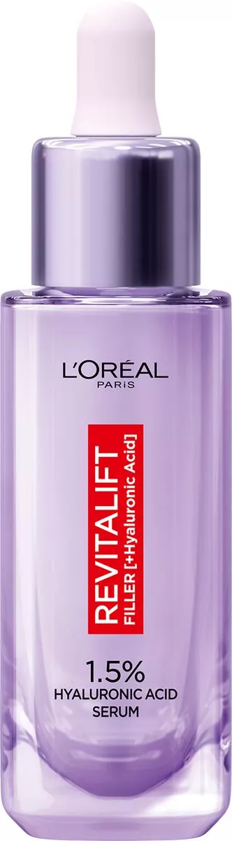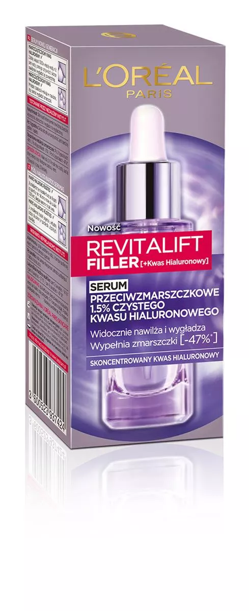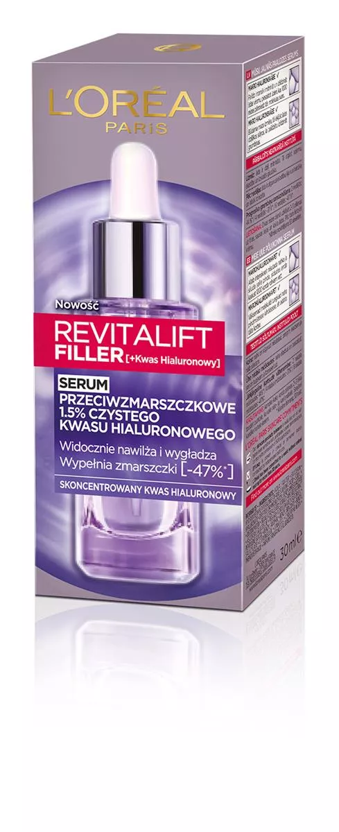 Kwas hialuronowy to naturalny składnik skóry, który wiąże i zatrzymuje wodę, zapewniając odpowiednie nawilżenie i wygładzenie. Niestety, z wiekiem jego poziom spada, co prowadzi do przesuszenia skóry, utraty sprężystości i powstawania zmarszczek. L'Oreal Paris Revitalift Filler Serum z 1,5% czystego kwasu hialuronowego to idealne rozwiązanie, które codziennie dostarcza skórze ultra-skoncentrowanego kwasu hialuronowego o wielopłaszczyznowym działaniu.