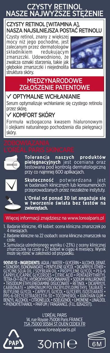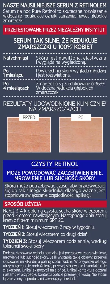 - Zawiera czysty retinol, silny składnik przeciwstarzeniowy.