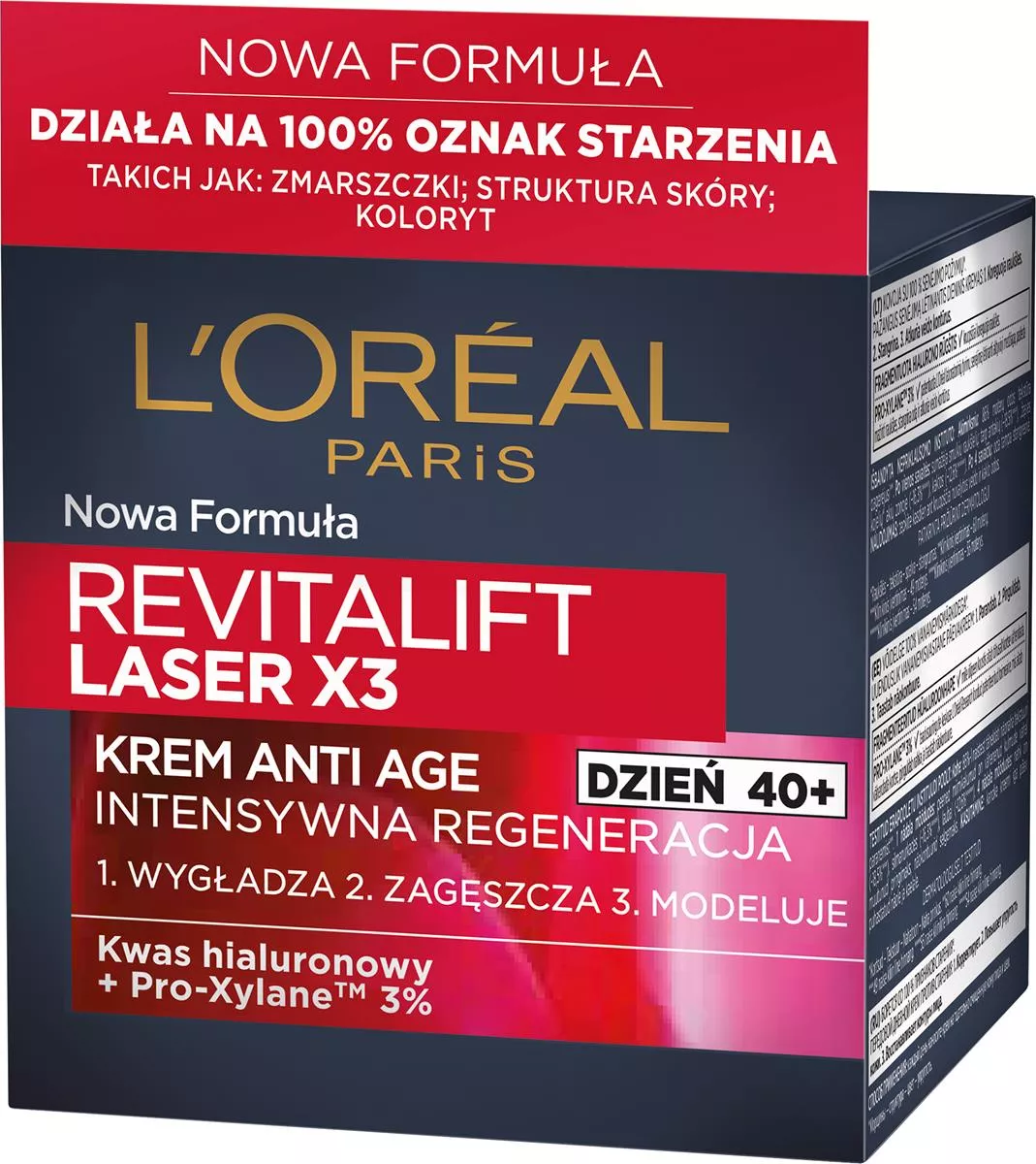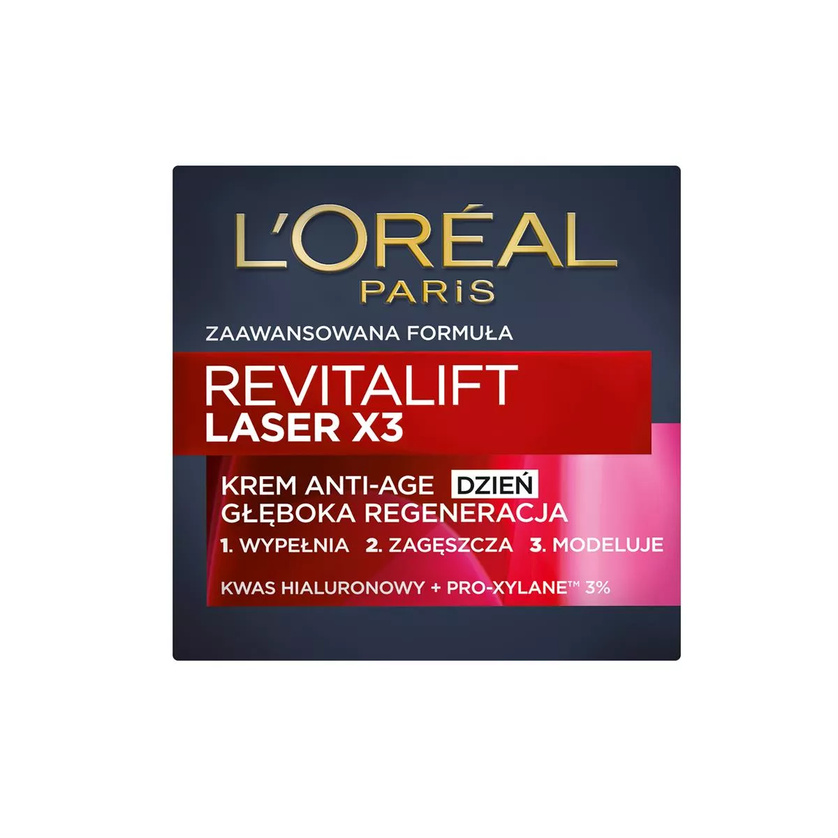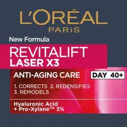 Krem anti-aging na dzień L'Oreal Paris Revitalift Laser X3 to wyjątkowy produkt o potrójnym działaniu, który pomoże Ci w walce z oznakami starzenia się skóry. Wzbogacony o trzy kluczowe składniki aktywne polecane przez dermatologów: pro-retinol, kwas hialuronowy oraz witaminę Cg. Każdy z tych składników działa synergicznie, aby zapewnić widoczne rezultaty: wygładzenie zmarszczek, intensywne ujędrnienie oraz rozświetlenie skóry. Już po pierwszym użyciu skóra jest bardziej nawilżona, a jej tekstura poprawiona. Po 6 miesiącach regularnego stosowania widoczność zmarszczek zmniejsza się nawet o 7 lat.