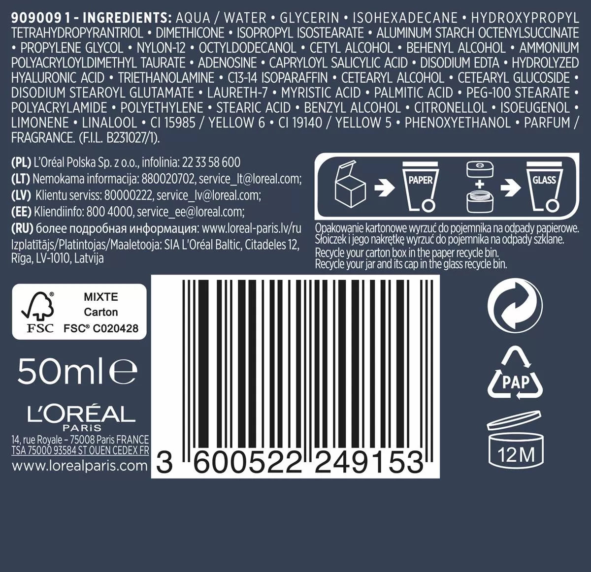 909280 35 - Aqua / Water • Glycerin • Isohexadecane • Hydroxypropyl Tetrahydropyrantriol • Dimethicone • Aluminum Starch Octenylsuccinate • Isopropyl Isostearate • Propylene Glycol • Nylon-12 • Octyldodecanol • Cetyl Alcohol • Behenyl Alcohol • Ammonium Polyacryloyldimethyl Taurate • Acetyl Dipeptide-1 Cetyl Ester • Adenosine • Capryloyl Salicylic Acid • Pentaerythrityl Tetra-di-t-butyl Hydroxyhydrocinnamate • Sodium Hyaluronate • Triethanolamine • Trisodium Ethylenediamine Disuccinate • Ascorbyl Glucoside • Retinyl Palmitate • Butylene Glycol • Cetearyl Alcohol • Cetearyl Glucoside • C13-14 Isoparaffin • Disodium Stearoyl Glutamate • Hydroxyethylcellulose • Laureth-7 • Myristic Acid • Palmitic Acid • Peg-100 Stearate • Polyacrylamide • Polyethylene • Sorbitan Laurate • Stearic Acid • Tocopherol • Benzyl Alcohol • Citronellol • Isoeugenol • Limonene • Linalool • Ci 15985 / Yellow 6 • Ci 19140 / Yellow 5 • Phenoxyethanol • Parfum / Fragrance (f.i.l. Z299156/1).