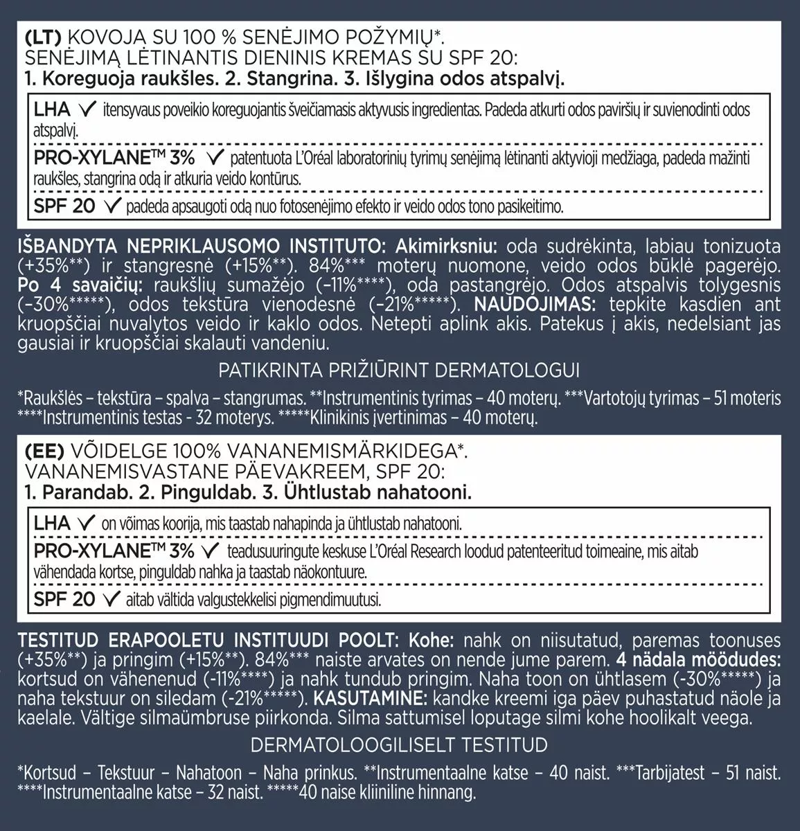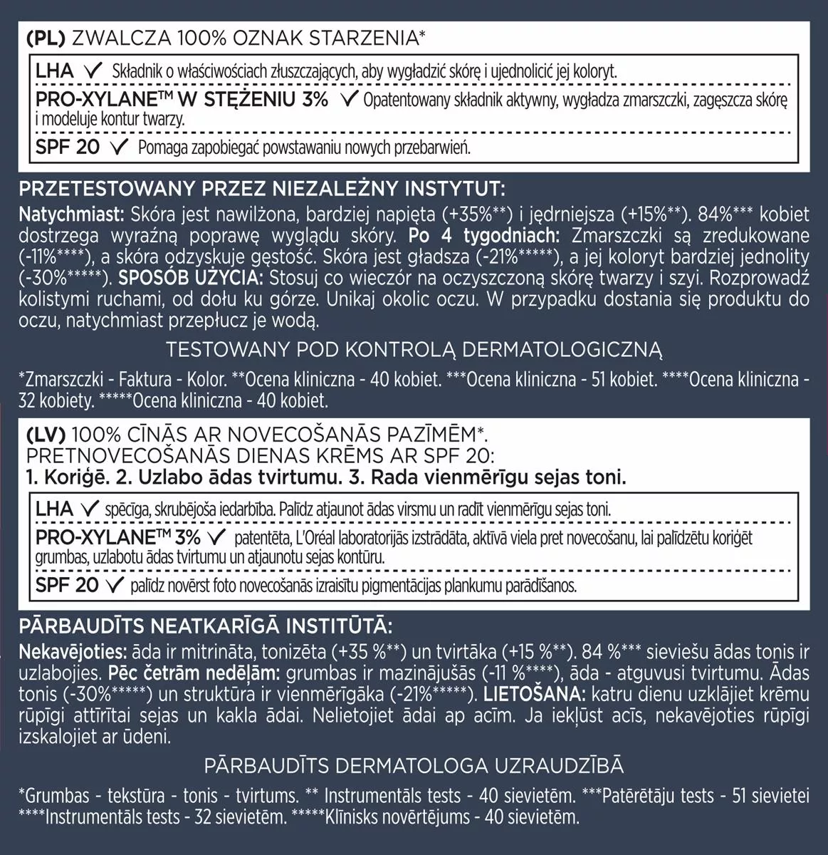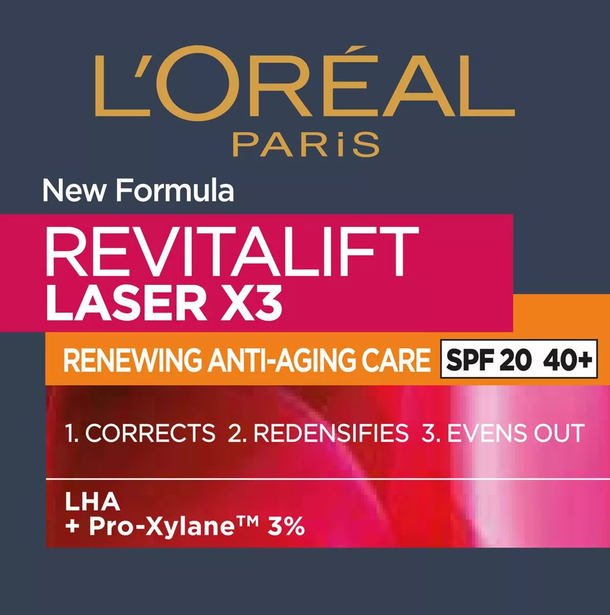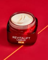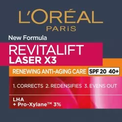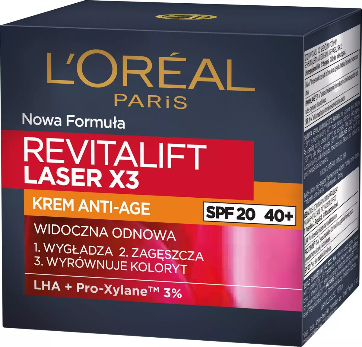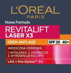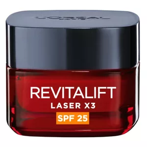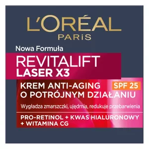 Krem anti-aging L'Oreal Paris Revitalift Laser X3 z SPF 25 to zaawansowany produkt do pielęgnacji skóry, wzbogacony o trzy topowe składniki aktywne, polecane przez dermatologów. Dzięki zawartości pro-retinolu, krem koryguje zmarszczki i odnawia teksturę skóry. Kwas hialuronowy zapewnia intensywne nawilżenie i ujędrnienie, a witamina Cg rozświetla skórę i ujednolica jej koloryt. Dodatkowo, krem oferuje ochronę przeciwsłoneczną z SPF 25, chroniąc skórę przed szkodliwym promieniowaniem UV i fotostarzeniem. Już po pierwszym użyciu skóra staje się bardziej sprężysta, a jej koloryt bardziej jednolity. Regularne stosowanie przez 6 miesięcy pozwala zredukować widoczność zmarszczek nawet o 7 lat.