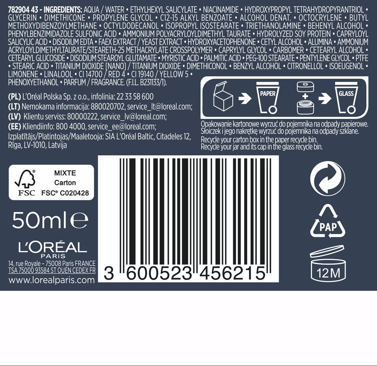 909314 24 - Aqua / Water • Ethylhexyl Salicylate • Niacinamide • Glycerin • Dimethicone • Propylene Glycol • Isopropyl Myristate • C12-15 Alkyl Benzoate • Octyldodecanol • Isopropyl Isostearate • Triethanolamine • Behenyl Alcohol • Phenylbenzimidazole Sulfonic Acid • Ammonium Polyacryloyldimethyl Taurate • Ethylhexyl Triazone • Butyl Methoxydibenzoylmethane • Lactobacillus/soybean Ferment Extract • Acetyl Dipeptide-1 Cetyl Ester • Capryloyl Salicylic Acid • Faex Extract / Yeast Extract • Hydroxyacetophenone • Pentaerythrityl Tetra-di-t-butyl Hydroxyhydrocinnamate • Sodium Citrate • Sodium Hyaluronate • Trisodium Ethylenediamine Disuccinate • Ascorbyl Glucoside • Retinyl Palmitate • Cetyl Alcohol • Boron Nitride • Alumina • Ammonium Acryloyldimethyltaurate/steareth-25 Methacrylate Crosspolymer • Butylene Glycol • Caprylyl Glycol • Carbomer • Cetearyl Alcohol • Cetearyl Glucoside • Disodium Stearoyl Glutamate • Hydroxyethylcellulose • Myristic Acid • Palmitic Acid • Peg-100 Stearate • Pentylene Glycol • Sorbitan Laurate • Stearic Acid • Tocopherol • Bis-ethylhexyloxyphenol Methoxyphenyl Triazine • Titanium Dioxide [nano] / Titanium Dioxide • Dimethiconol • Benzyl Alcohol • Citronellol • Isoeugenol • Limonene • Linalool • Ci 14700 / Red 4 • Ci 19140 / Yellow 5 • Phenoxyethanol • Parfum / Fragrance (f.i.l. Z295496/1).
