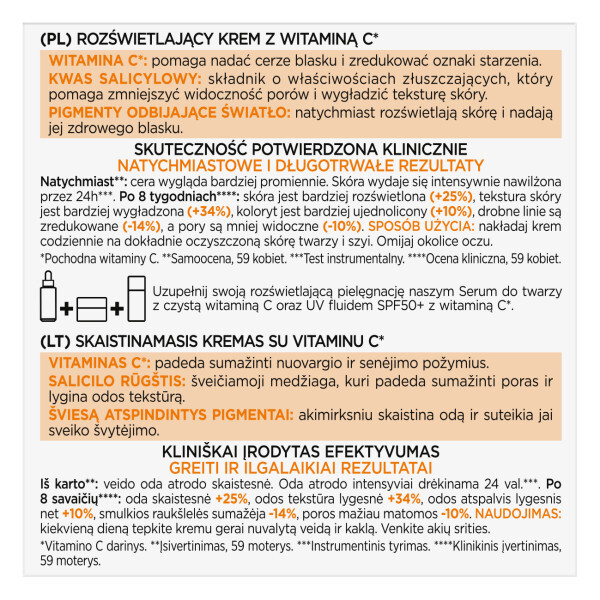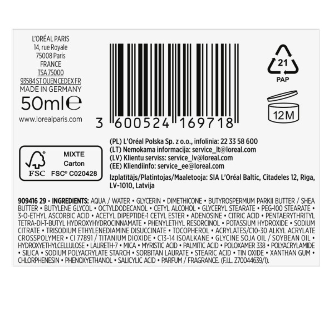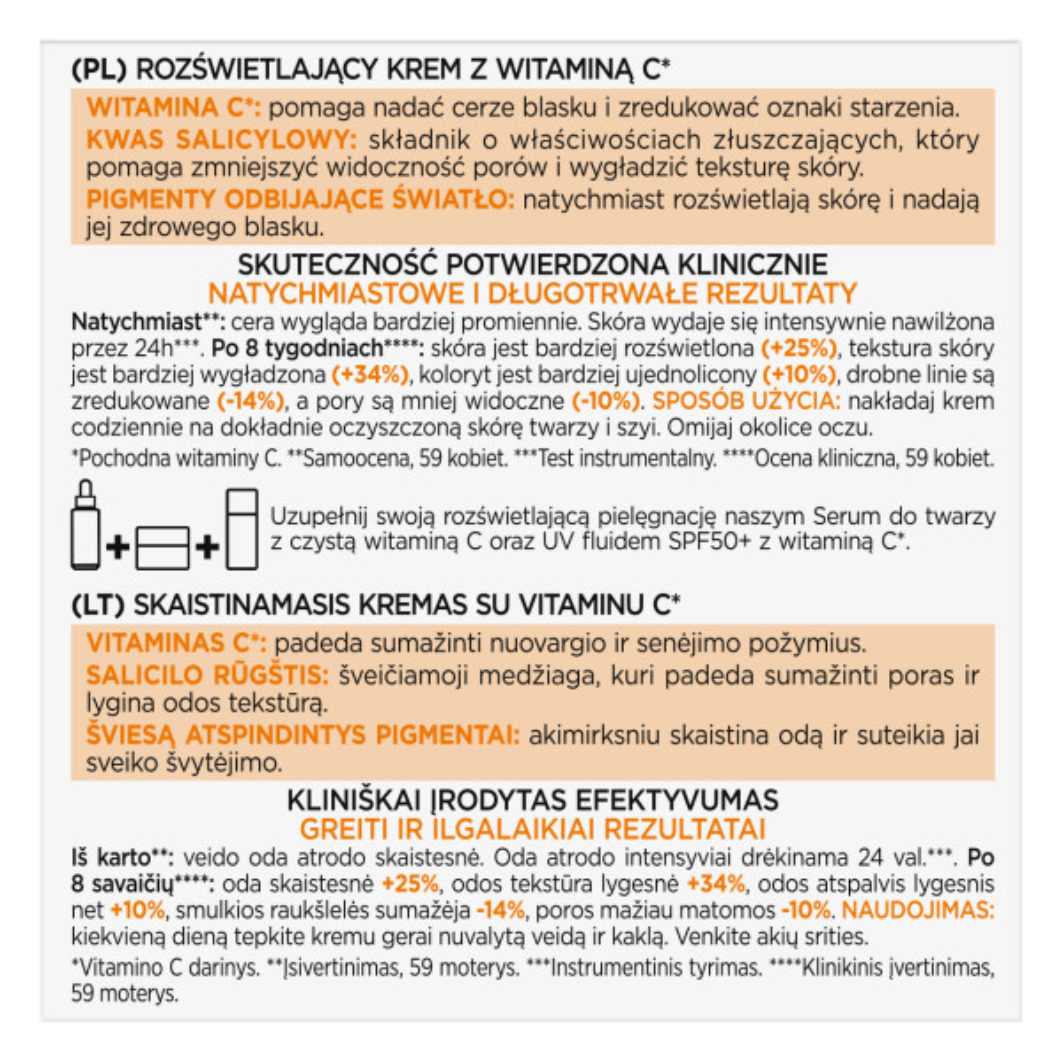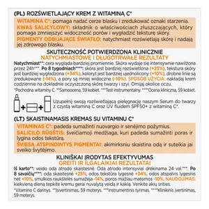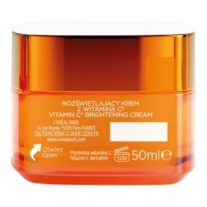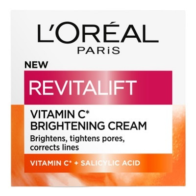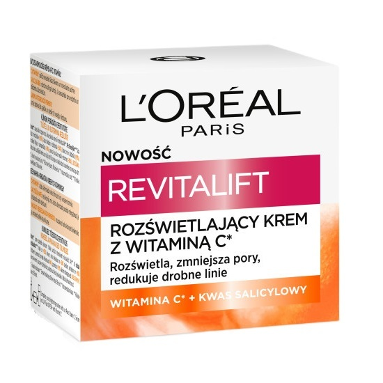 Chciałabyś wygładzić skórę i dodać jej blasku? L'Oreal Paris Revitalift Rozświetlający krem z witaminą C został stworzony, aby rozświetlić skórę, zmniejszyć widoczność porów oraz zredukować drobne linie. Jego lekka formuła, wzbogacona o pochodną witaminy C, kwas salicylowy oraz pigmenty odbijające światło, natychmiastowo nadaje cerze promienny wygląd. Regularne stosowanie kremu pomaga wygładzić skórę i zmniejszyć oznaki starzenia. Jest to doskonałe uzupełnienie rozświetlającej pielęgnacji Revitalift – idealnie współgra z Serum z czystą witaminą C oraz UV fluidem SPF50+.