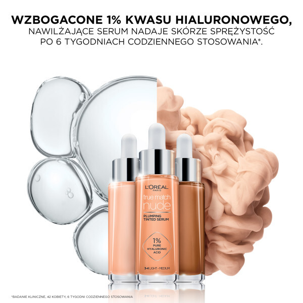 Odkryj nowość L'Oreal Paris True Match Nude, skoncentrowane serum w podkładzie Light, 30ml, które wyrównuje koloryt skóry dzięki zawartości 1% kwasu hialuronowego, nadając jej sprężystość. To idealne połączenie pielęgnacji i makijażu. Innowacyjna formuła łączy zalety serum pielęgnacyjnego z blaskiem i kryciem podkładu, nawilżając skórę i zapewniając jej promienne, nieskazitelne krycie. Efekty pielęgnacji są widoczne natychmiast, a formuła idealnie dopasowuje się do skóry, pozostawiając ją naturalnie świetlistą dla efektu no makeup.