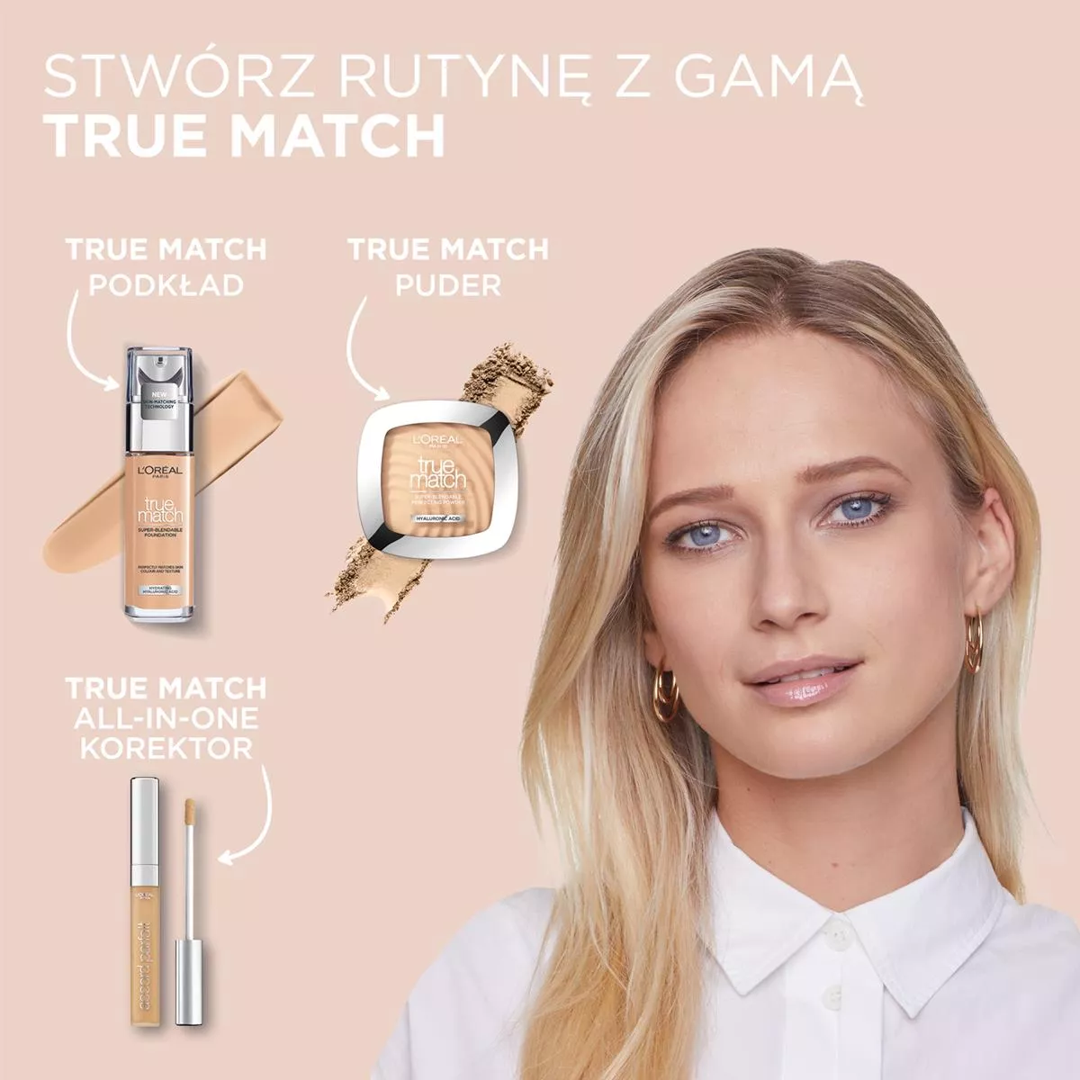 Odkryj nową formułę podkładu True Match od L'Oréal Paris. Dzięki innowacyjnej technologii dopasowania do skóry, po raz pierwszy wykorzystano aż 6 pigmentów, w tym zielone i niebieskie, które są kluczowe dla dopasowania odcienia dla bardzo jasnych czy oliwkowych karnacji. Aż 99,5% kobiet znalazło swój idealny odcień. Formuła podkładu zawiera 80% nawilżającego kompleksu z kwasem hialuronowym, zapewniając długotrwałe nawilżenie i komfort do 24 godzin. Podkład widocznie poprawia jakość skóry w ciągu 2 tygodni – cera staje się gładsza i bardziej rozświetlona. Produkt jest odpowiedni dla cery wrażliwej i posiada SPF 17. Wybierz podkład numer 1 w Polsce i Europie - True Match od L'Oréal Paris.