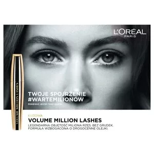 Podkreśl swoje spojrzenie kultowym tuszem do rzęs Volume Million Lashes od L'Oréal Paris! Dzięki wyjątkowej formule Twoje rzęsy zyskają zjawiskową, 8 razy większą objętość. Silikonowa szczoteczka millionizer zapewnia efekt idealnie rozdzielonych i wydłużonych rzęs bez grudek, wydłużając je nawet o 60%! Wyjątkowa formuła została wzbogacona o drogocenne olejki, co sprawia, że Twoje spojrzenie będzie nie tylko piękne, ale i zadbane. Jesteś tego warta!