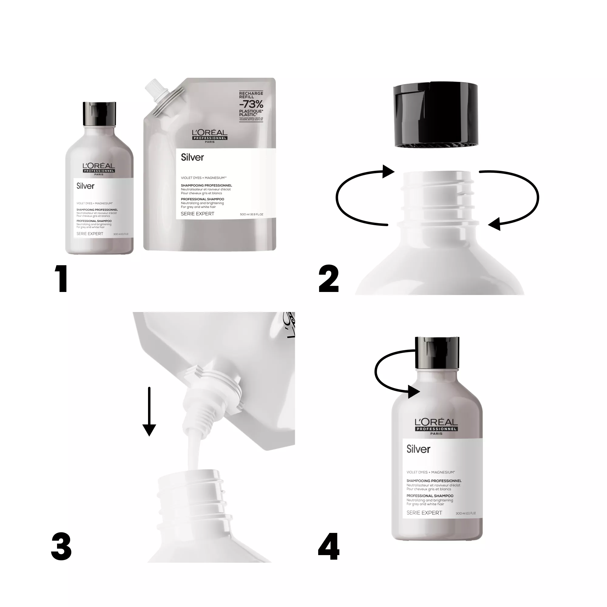 Szampon Silver eliminuje delikatny żółty odcień na włosach rozjaśnionych oraz ożywia połysk siwych włosów. Do spotęgowania efektu zaleca się używać szamponu 2 razy w tygodniu.