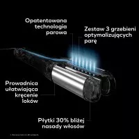 Para wodna w Steampod 4 zapewnia włosom wilgotność, nie zabierając jej jak klasyczna prostownica, co sprawia, że włosy nie puszą się nawet przy wyższej wilgotności powietrza. Urządzenie wyposażone jest w podwójną technologię płytek z powłoką o wysokiej odporności, co umożliwia płynne ruchy z odpowiednim naciskiem na włosy. System kontroli ciepła oferuje 3 opcje ustawień temperatury od 180°C do 210°C.