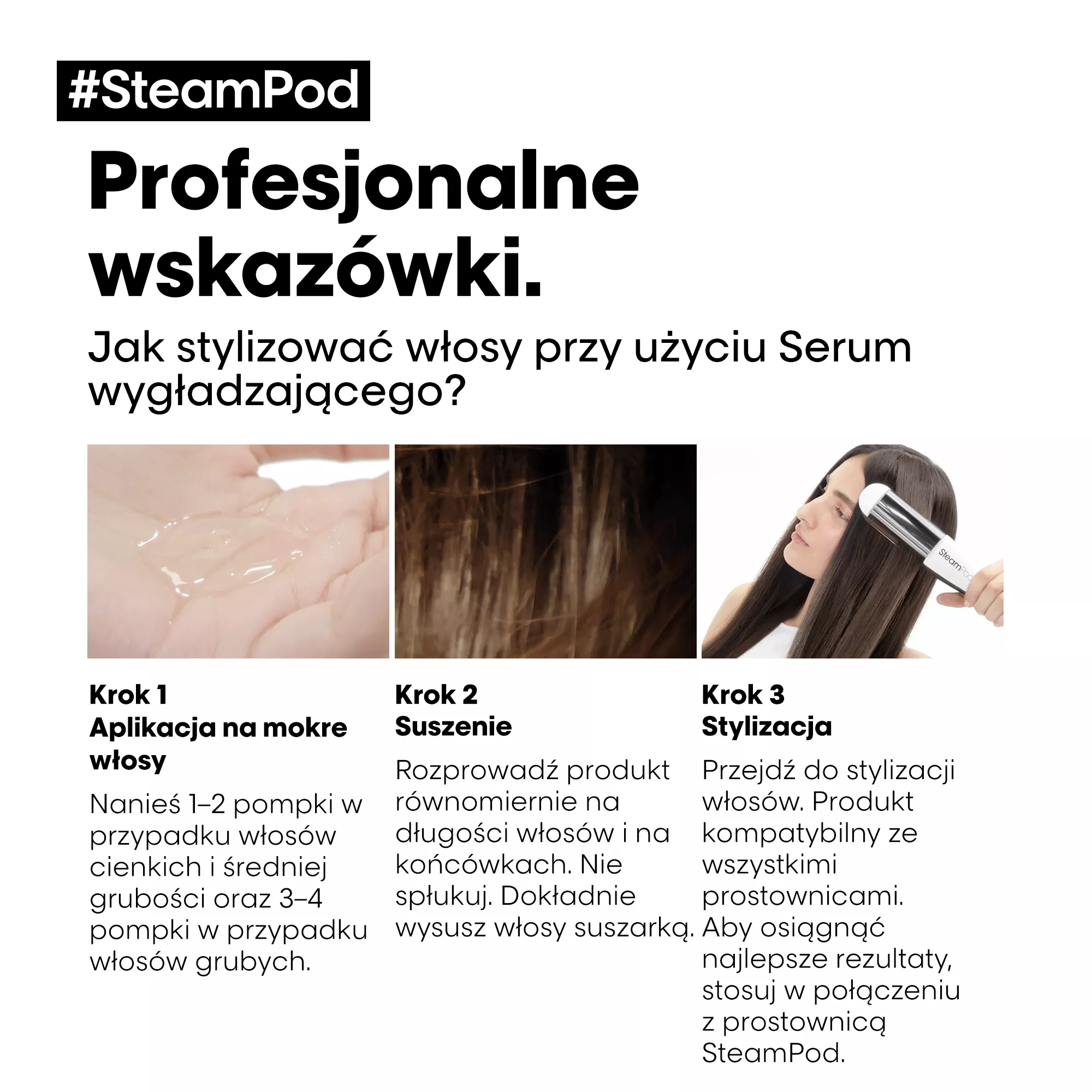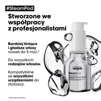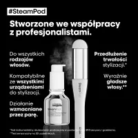 Nanieś 1–2 pompki serum L'Oréal Professionnel SteamPod na cienkie i normalne włosy lub 3–4 pompki preparatu w przypadku włosów grubych i gęstych. Aplikuj na długości i końcówki umytych i osuszonych ręcznikiem włosów. Nie spłukuj. Dokładnie wysusz włosy suszarką, a następnie użyj prostownicy. Aby uzyskać najlepsze rezultaty stosuj z prostownicą parową L'Oréal Professionnel SteamPod.