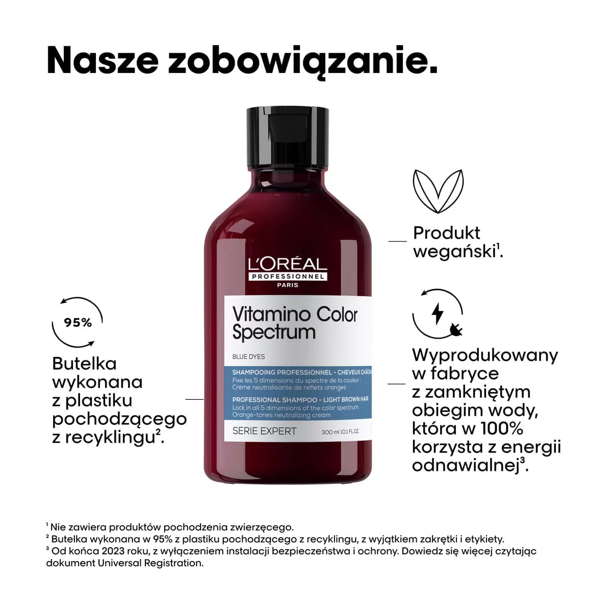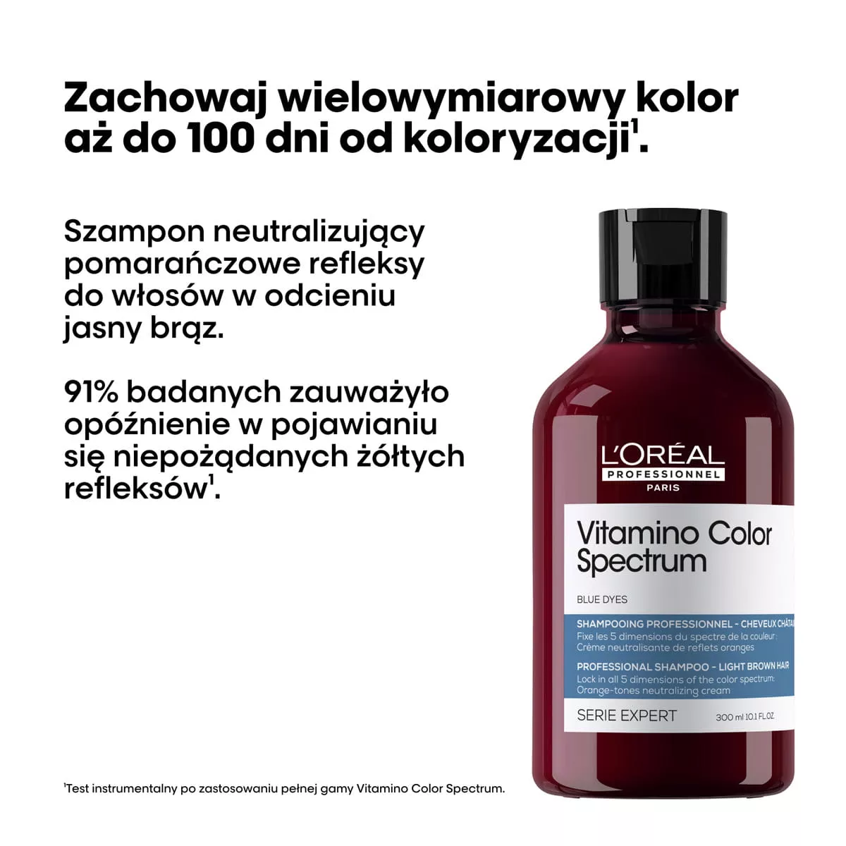 Szampon Loreal Vitamino Color Spectrum Blue to idealne rozwiązanie dla osób z jasnobrązowymi włosami, które pragną zneutralizować niechciane pomarańczowe odcienie. Specjalnie opracowana przez ekspertów z L'Oréal Professionnel Paris formuła zapewnia intensywność koloru i niezwykle wysoki połysk tafli lustra aż do 100 dni* od koloryzacji. Włosy są nie tylko oczyszczone, ale również odżywione i wzmocnione.