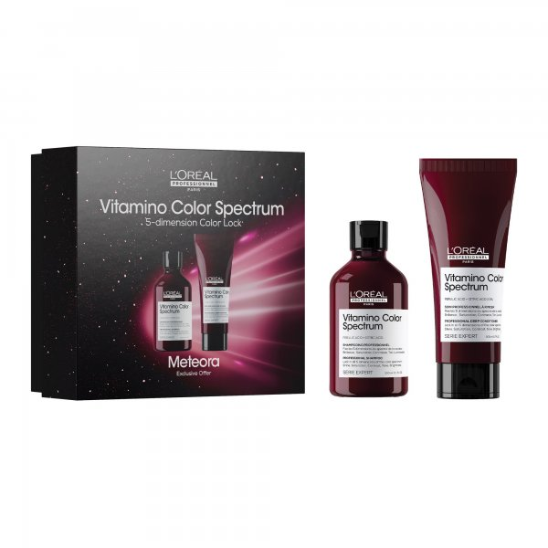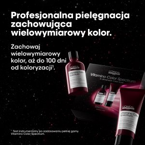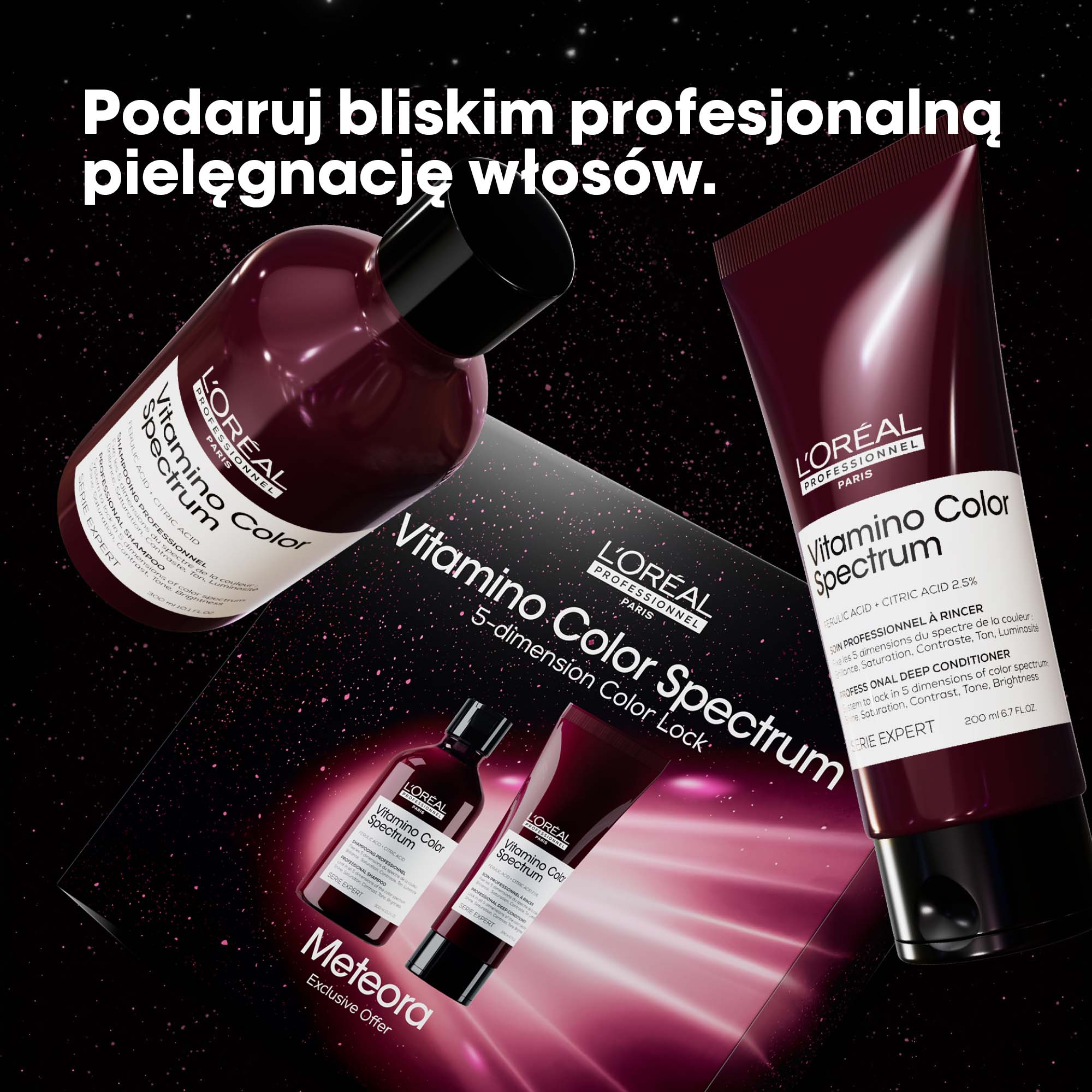 Odkryj profesjonalną pielęgnację włosów koloryzowanych z zestawem prezentowym Loreal Vitamino Color Spectrum Duo. To wyjątkowe połączenie szamponu i odżywki, które zapewnia aż do 100 dni wielowymiarowego koloru1, intensywny połysk oraz skuteczną ochronę włosów farbowanych. Formuły oparte na zaawansowanych technologiach L'Oréal Professionnel gwarantują wzmocnienie, odżywienie i długotrwałe nawilżenie, by Twoje włosy zachwycały blaskiem i zdrowym wyglądem każdego dnia.