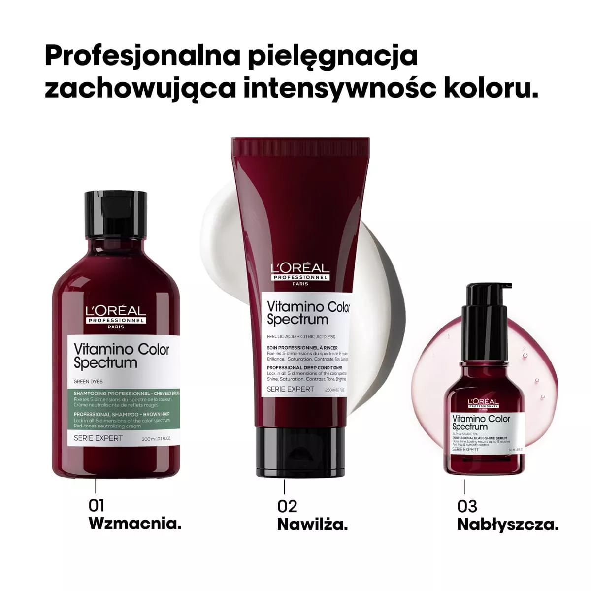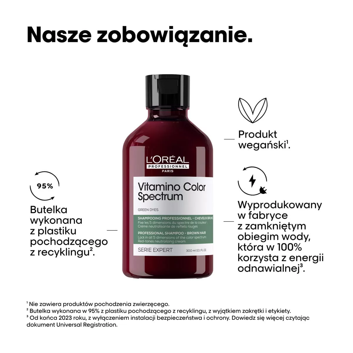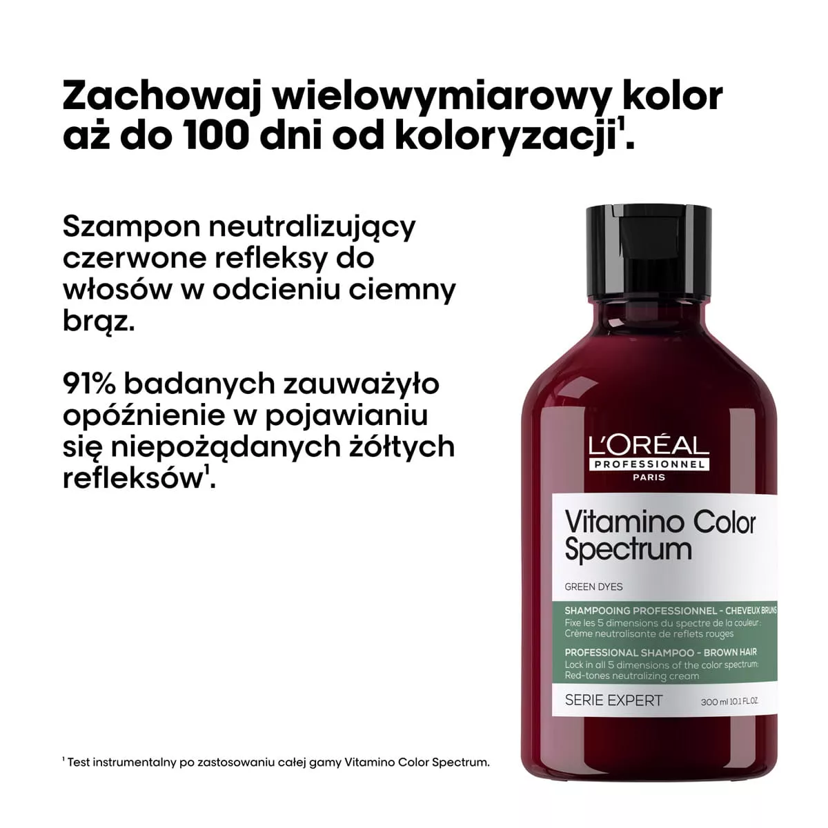Pielęgnacja Loreal Vitamino Color Spectrum Green to idealne rozwiązanie dla włosów ciemnobrązowych, które potrzebują neutralizacji czerwonych refleksów. Dzięki swojej innowacyjnej formule, szampon ten pomaga zachować intensywność koloru od pierwszego dnia koloryzacji aż do 100 dni*. Gwarantuje niezwykle wysoki połysk oraz bogate i żywe kolory, pozostawiając włosy oczyszczone, odżywione i mocniejsze.
