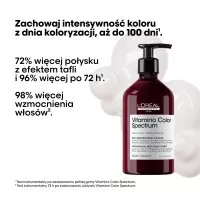 Odżywka z gamy Vitamino Color Spectrum od L'Oréal Professionnel Paris została opracowana dla wszystkich rodzajów włosów farbowanych. Kosmetyk wzmacnia włosy od wewnątrz, dzięki czemu stają się mocniejsze, gładsze i bardziej zdyscyplinowane. Wzbogacona o składniki odżywcze, kremowa formuła zapewnia efekt we wszystkich 5 wymiarach koloru**: ultramocny połysk tafli, bogate kolory, optymalną głębię odcieni koloru, brak niepożądanych refleksów oraz przejścia tonalne pomiędzy jasnymi i ciemnymi refleksami.