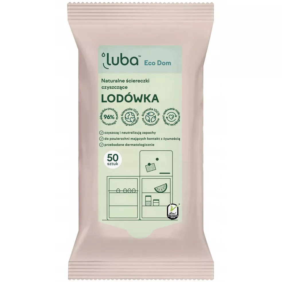 Naturalne, czyszczące, nawilżane ściereczki Luba Eco Dom to idealny sposób na utrzymanie czystości i świeżości w lodówce. Neutralizują nieprzyjemne zapachy, pozostawiając długotrwały, subtelny zapach odświeżenia. Ściereczki są przebadane dermatologicznie, przyjazne dla skóry dłoni oraz idealne do powierzchni mających kontakt z żywnością. Ściereczka jest w 100% biodegradowalna i kompostowalna, a receptura składa się w 96% ze składników pochodzenia naturalnego. Opakowanie może podlegać recyklingowi.