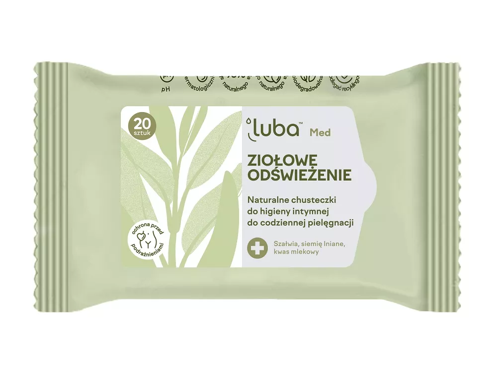 Luba Med Ziołowe Odświeżenie to naturalne chusteczki do higieny intymnej, które idealnie sprawdzą się w codziennej pielęgnacji i odświeżeniu. Dzięki recepturze o fizjologicznym pH, są szczególnie polecane do delikatnej skóry. Zawierają 98% składników pochodzenia naturalnego, a ich formuła oparta jest na filtrowanej wodzie wzbogaconej ekstraktami z szałwii i siemienia lnianego oraz kwasem mlekowym, co zapewnia uczucie regeneracji i nawilżenia. Po użyciu chusteczki pozostawiają skórę czystą, świeżą i przyjemnie pachnącą.