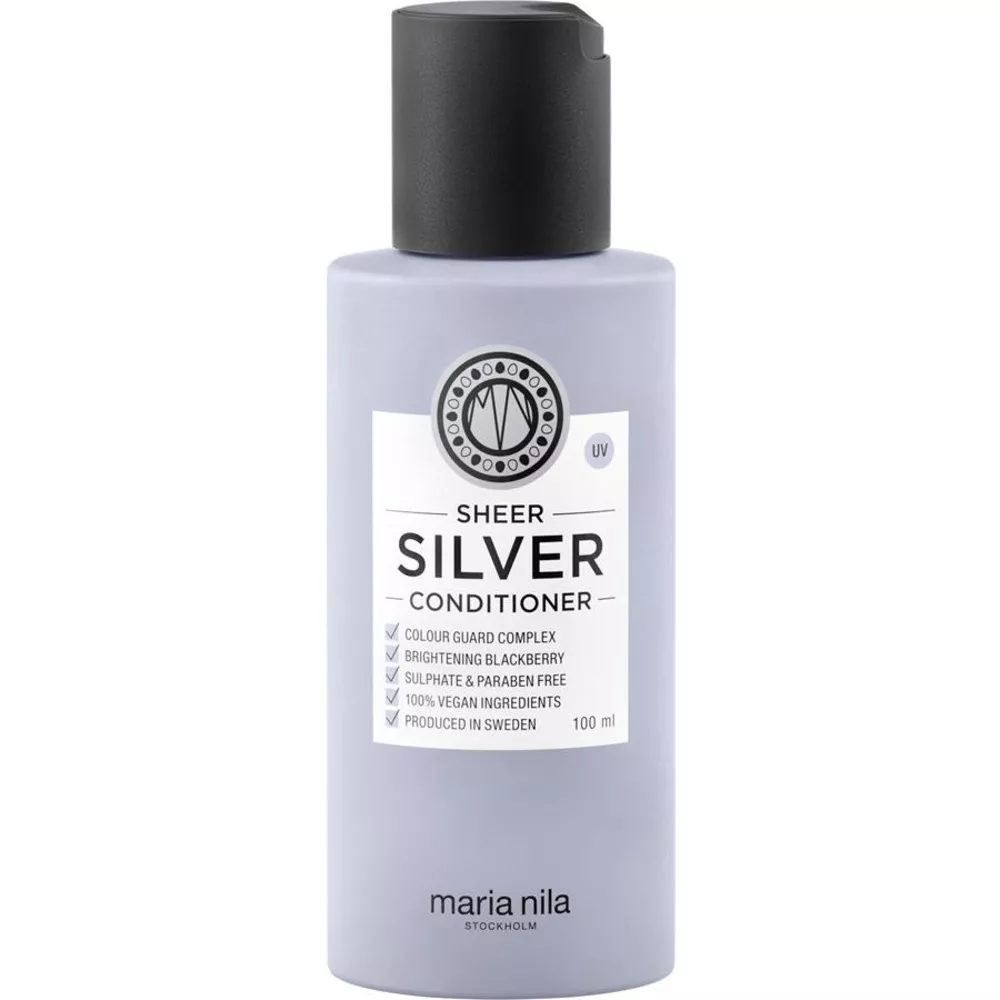 Maria Nila Sheer Silver Conditioner to odżywka stworzona z myślą o włosach blond, rozjaśnianych oraz siwych. Produkt skutecznie ułatwia rozczesywanie, jednocześnie zmiękczając, nawilżając i wzmacniając włosy. Dzięki zawartości fioletowego pigmentu i ekstraktu z jeżyny neutralizuje niepożądane złociste odcienie, dodając blasku i podkreślając kolor włosów. Odżywka charakteryzuje się świeżym, owocowo-kwiatowym zapachem jaśminu, pomarańczy i grejpfruta.