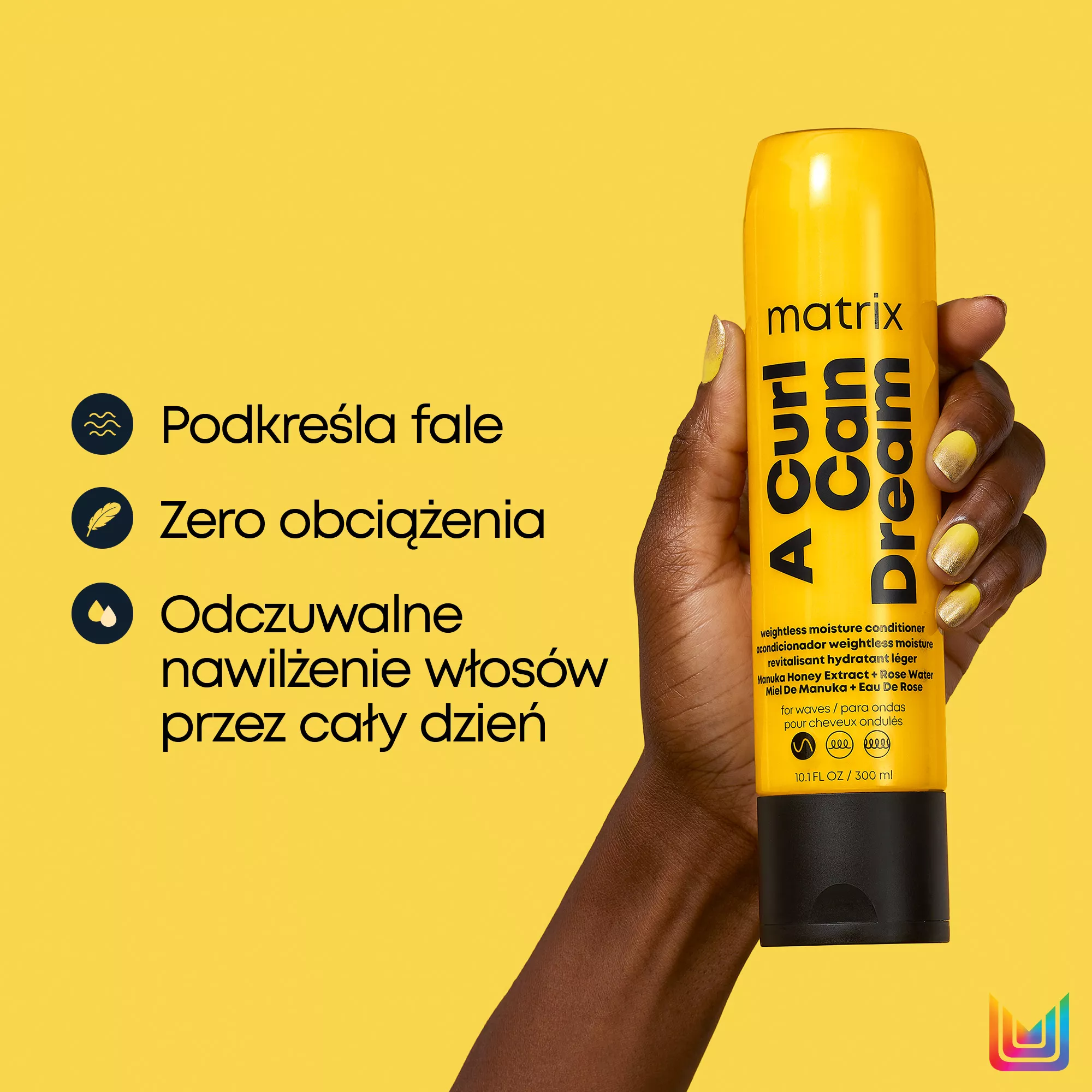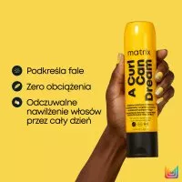 A Curl Can Dream to profesjonalna gama od Matrix, która dba o strukturę fal i loków od pielęgnacji po stylizację, dzień po dniu. Gama opracowana została wspólnie z ekspertami i przetestowana na różnych typach kręconych włosów. Składnikiem przewodnim jest ekstrakt z miodu Manuka, który jest naturalnym humektantem i pomaga utrzymać nawilżenie włosów falowanych i kręconych. Odżywka nawilżająca do włosów falowanych, wzbogacona w ekstrakt z miodu Manuka i wodę różaną. Zapewnia aż 48 godzinne podkreślenie fal bez obciążenia!* Uzyskaj lśniące, sprężyste i podatne na układanie oraz nawilżone przez cały dzień włosy.