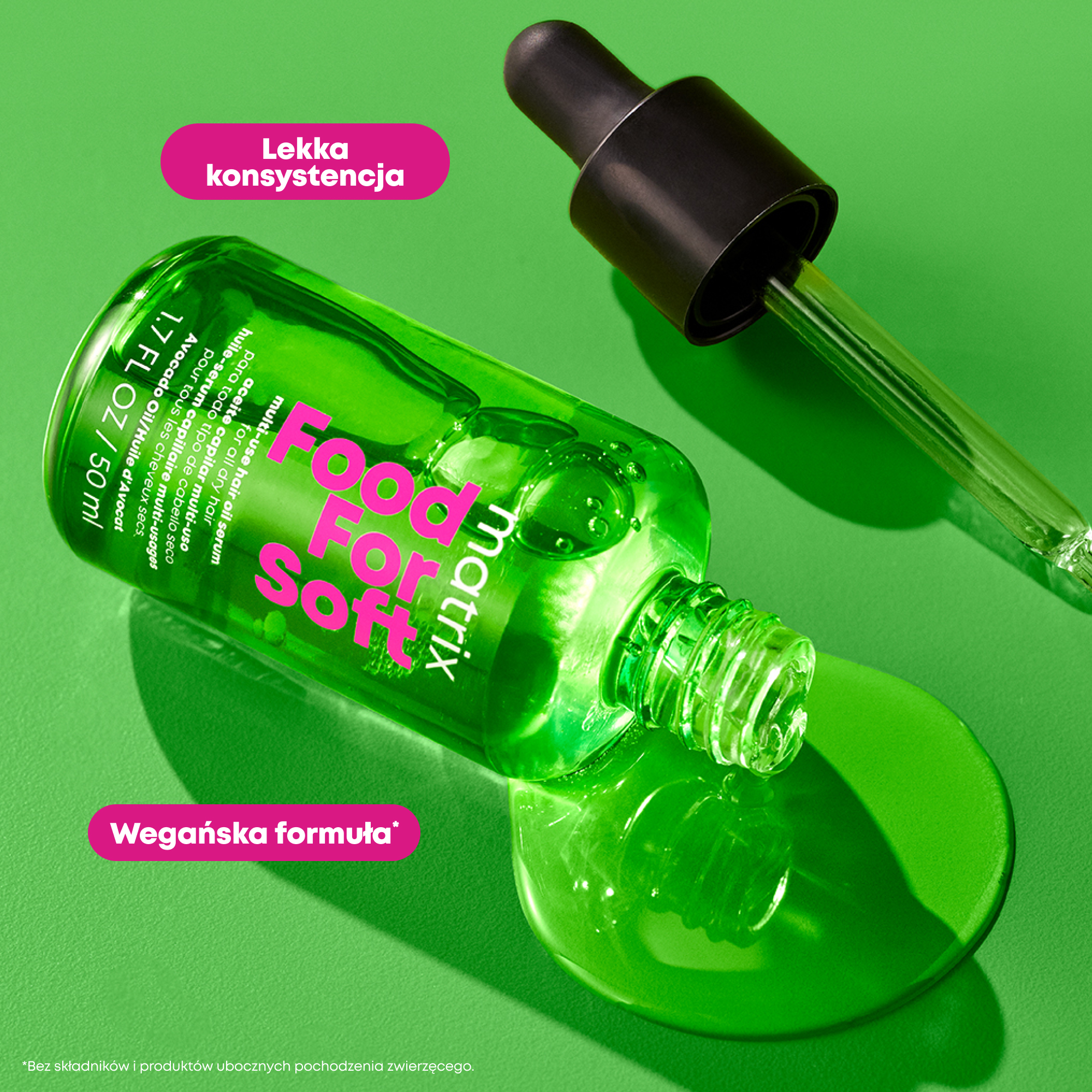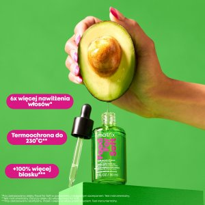 Olejek do włosów Matrix Food For Soft to wielozadaniowa kuracja, nasycona olejem z awokado, która pomaga w utrzymaniu odpowiedniego poziomu nawilżenia włosów, pozostawiając je błyszczące i gładkie. Dodatkowo chroni włosy przed negatywnym działaniem wysokiej temperatury podczas stosowania urządzeń termicznych do stylizacji (nawet do 230°C). Kosmetyk jest polecany do włosów, które potrzebują nawilżenia. Odwodnienie można poznać po tym, że pasma są matowe, kruche i suche. Po dostarczeniu kosmykom optymalnej dawki nawilżenia, włosy odzyskują miękkość, blask i elastyczność.