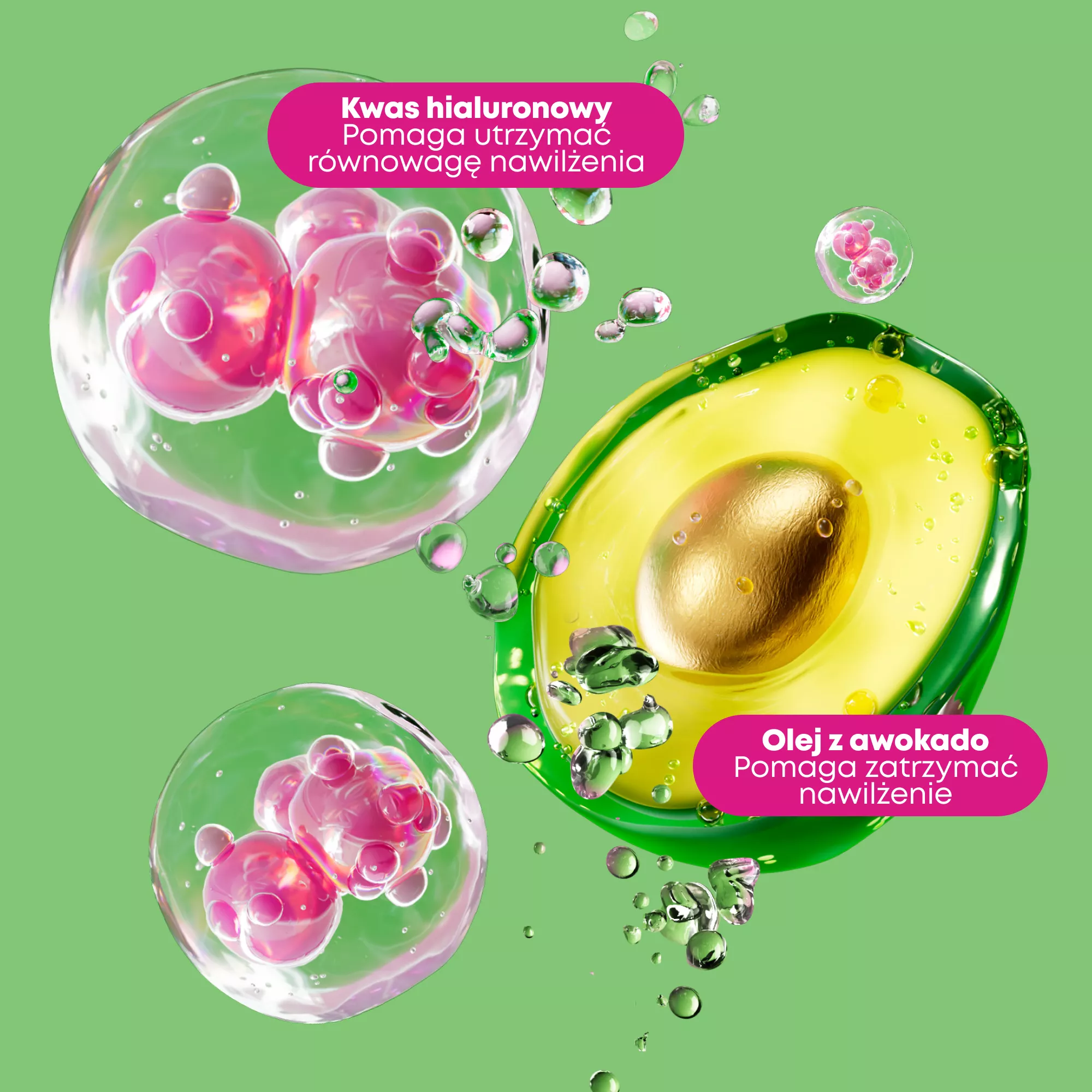Olej z awokado jest bogaty w niezbędne nienasycone kwasy tłuszczowe. Pomaga zamknąć łuskę wlosy, dzięki czemu wilgoć nie ucieka z jego struktury. POnado odżywia, dodaje miękkości, blasku i gładkości. Lekka formuła pozwala na szerokie zastosowanie. Z kolei kwas hialuronowy o właściwościach higroskopijnych pomaga w nawilżeniu wszystkich rodzajów włosów i działa wygładzająco. Ponadto zmiękcza pasma.