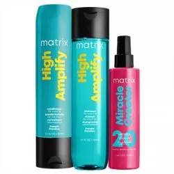 Twoje włosy cierpią na brak objętości? Są oklapnięte, cienkie i nie chcą się układać? Ich stylizację zacznij od odpowiedniej pielęgnacji. Pomoże Ci w tym gotowy zestaw kosmetyków do cienkich włosów Matrix High Amplify. W skład zestawu wchodzą szampon i odżywka, dające efekt dodatkowej objętości. W składzie tych kosmetyków znajdują się proteiny, które sprawiają, że włosy są przyjemnie puszyste, zyskują fenomenalną strukturę i cudowny kształt. Kosmetyki nie zawierają silikonów. Teraz ten kultowy zestaw dostępny z maską w sprayu Matrix Total Results Miracle Creator. To ekspresowa kuracja, która nawilża włosy, wzmacnia je, odżywia, poprawia wygląd, dodaje blasku i zapewnia termoochronę.