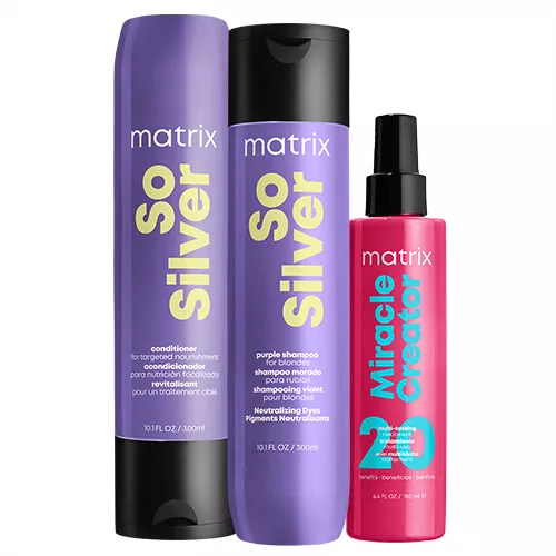 Zapomnij o ciepłych tonach i żółtych nalotach. Teraz możesz cieszyć się czystością i zimnym odcieniem włosów siwych. Mamy na to gotowy sposób. Przygotowaliśmy zestaw Matrix So Silver. Kosmetyki te przedłużają trwałość koloru i pozostawiają pasma przyjemnie gładkie, a do tego działają antyutleniająco i neutralizują niechciane odcienie. Seria dedykowana jest włosom platynowym, pozbawionym blasku, wypłowiałym. Teraz wasz ulubiony zestaw So Silver wzbogacony jest o maskę w sprayu Miracle Creator 20w1. Ten spray bez spłukiwania odmienia włosy w kilka chwil i sprawia, że każdego dnia są zdrowsze, mocniejsze i piękniejsze.