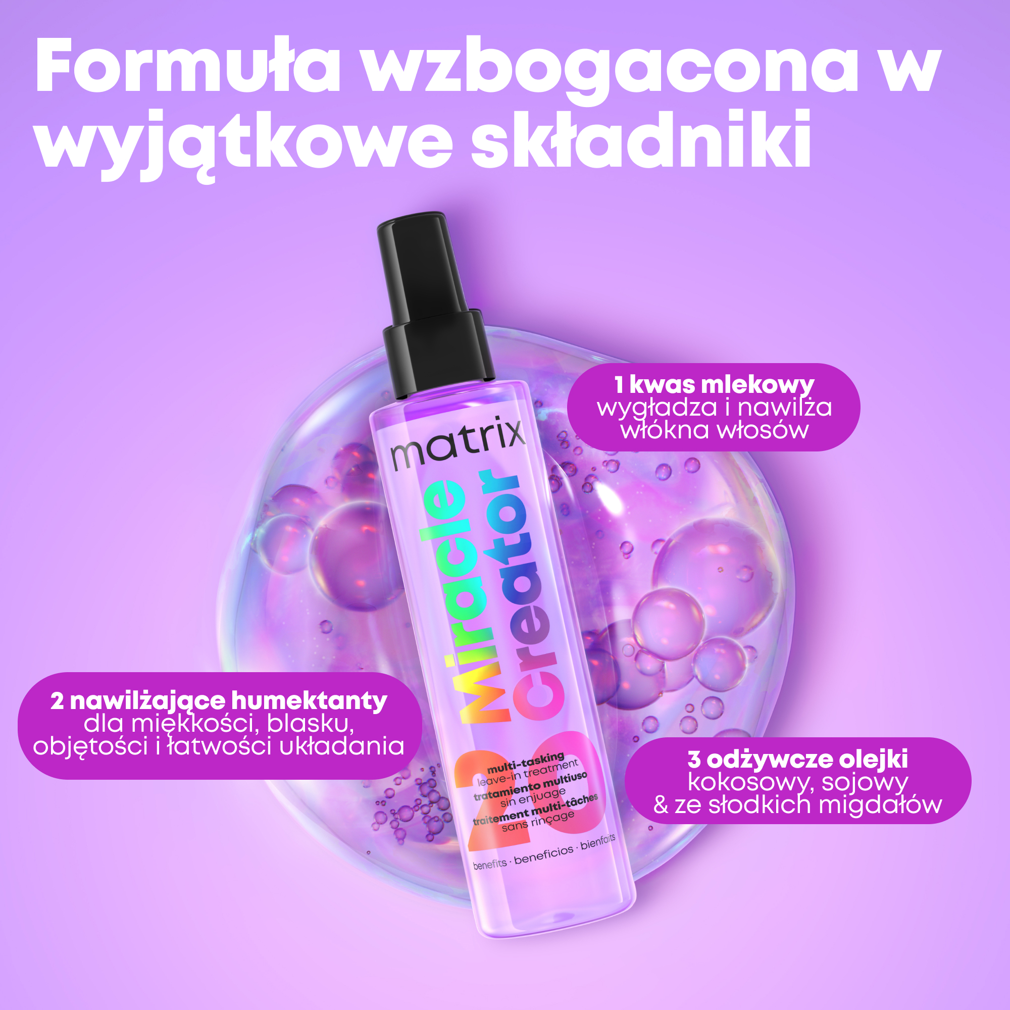 Miracle Creator to wielozadaniowa pielęgnacja bez spłukiwania z 20 korzyściami dla zdrowo wyglądających włosów! Stosuj zawsze, gdy Twoje włosy potrzebują: odżywienia, wzmocnienia połysku, gładkości, łatwiejszego suszenia, kontroli puszenia, wygładzenia łuski włosa, zmiękczenia, ochrony przed rozdwajaniem się końcówek, nawilżenia, zmniejszenia podatności na uszkodzenia, ochrony przed wilgocią, ułatwienia w rozczesywaniu, zwiększenia podatności na układanie, podkładu stylizującego, ochrony przed blaknięciem koloru, podkreślenia, wzmocnienia, długotrwałego zapachu, sprężystości oraz ochrony przed wysoką temperaturą 230oC!*