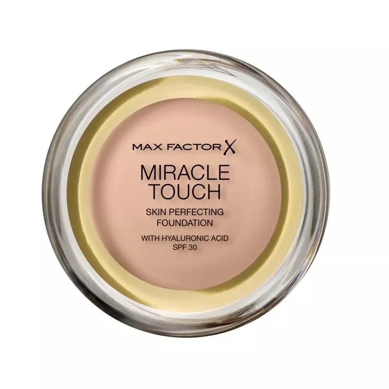Max Factor Miracle Touch Skin Perfecting Foundation to kremowy podkład do twarzy, który udoskonala wygląd cery. Łączy lekkość płynnego podkładu ze znakomitym działaniem kryjącym, charakterystycznym dla podkładów w kompakcie. Doskonale ukrywa drobne zmarszczki i minimalizuje widoczność porów, nadając cerze nieskazitelny, świeży i idealnie gładki wygląd. Unikalna formuła została wzbogacona o kwas hialuronowy i filtr SPF30, co zapewnia długotrwałe nawilżenie skóry i ochronę przed promieniowaniem słonecznym.
