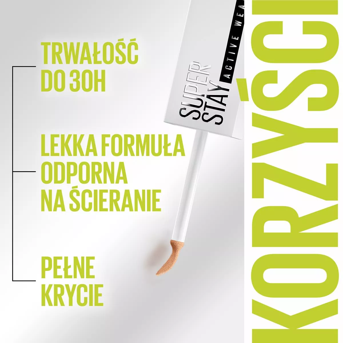 Maybelline New York Super Stay Active Wear to korektor zapewniający trwałość do 30 godzin* oraz pełne krycie. Dzięki lekkiej formule redukuje cienie pod oczami i wszelkie niedoskonałości, jednocześnie zachowując naturalny efekt na skórze oraz komfort noszenia. Wyposażony w elastyczny aplikator, umożliwia łatwą i równomierną aplikację. Korektor nie zbiera się w załamaniach skóry i jest odporny na ścieranie, a jego wegańska formuła jest niekomedogenna, testowana alergologicznie i odpowiednia dla każdego typu cery, w tym tłustej i wrażliwej. Produkt odporny na pot i wilgoć, doskonały do noszenia pod maseczkami - nie ściera się. Formuła wzbogacona o witaminę E zapewnia matowe wykończenie oraz uczucie nawilżenia bez przesuszania.