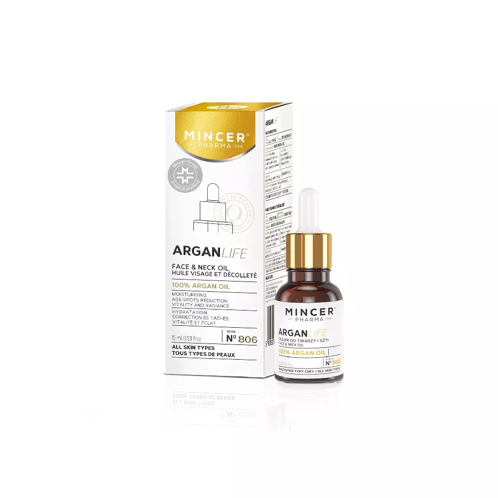 Mincer Pharma ArganLife olejek do twarzy i szyi No.806 to wyjątkowy produkt z linii Argan Life, który zapewnia głębokie nawilżenie i regenerację skóry. Dzięki niemu skóra odzyskuje witalność oraz blask, a plamy pigmentacyjne ulegają redukcji.