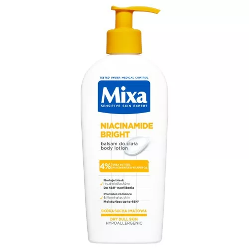 Balsam do ciała Mixa Niacinamide Bright to rozświetlający i nawilżający kosmetyk, który dzięki zawartości niacynamidu i witaminy Cg pomaga wydobyć zdrowy i promienny wygląd skóry oraz wspiera redukcję widocznych przebarwień.