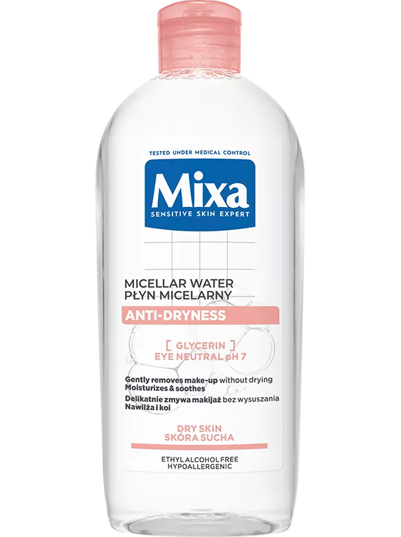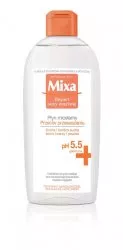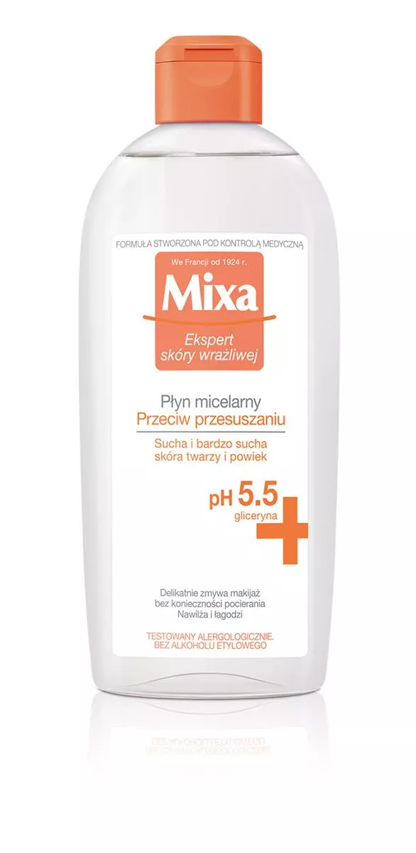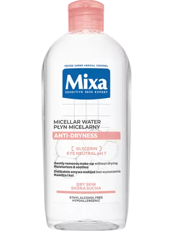Mixa Przeciw przesuszaniu, płyn micelarny o pojemności 400 ml, to idealne rozwiązanie dla demakijażu wrażliwej skóry suchej i bardzo suchej. Dzięki formule z micelami skutecznie usuwa makijaż i zanieczyszczenia, ograniczając do minimum konieczność pocierania. Posiada fizjologiczne pH 5,5, identyczne z pH skóry, co pomaga chronić jej barierę ochronną. Wrażliwa skóra jest nawilżona i ukojona, a zawartość gliceryny dodatkowo chroni przed wysuszaniem i łagodzi podrażnienia. Skład został dobrany tak, aby minimalizować ryzyko wystąpienia reakcji alergicznych.